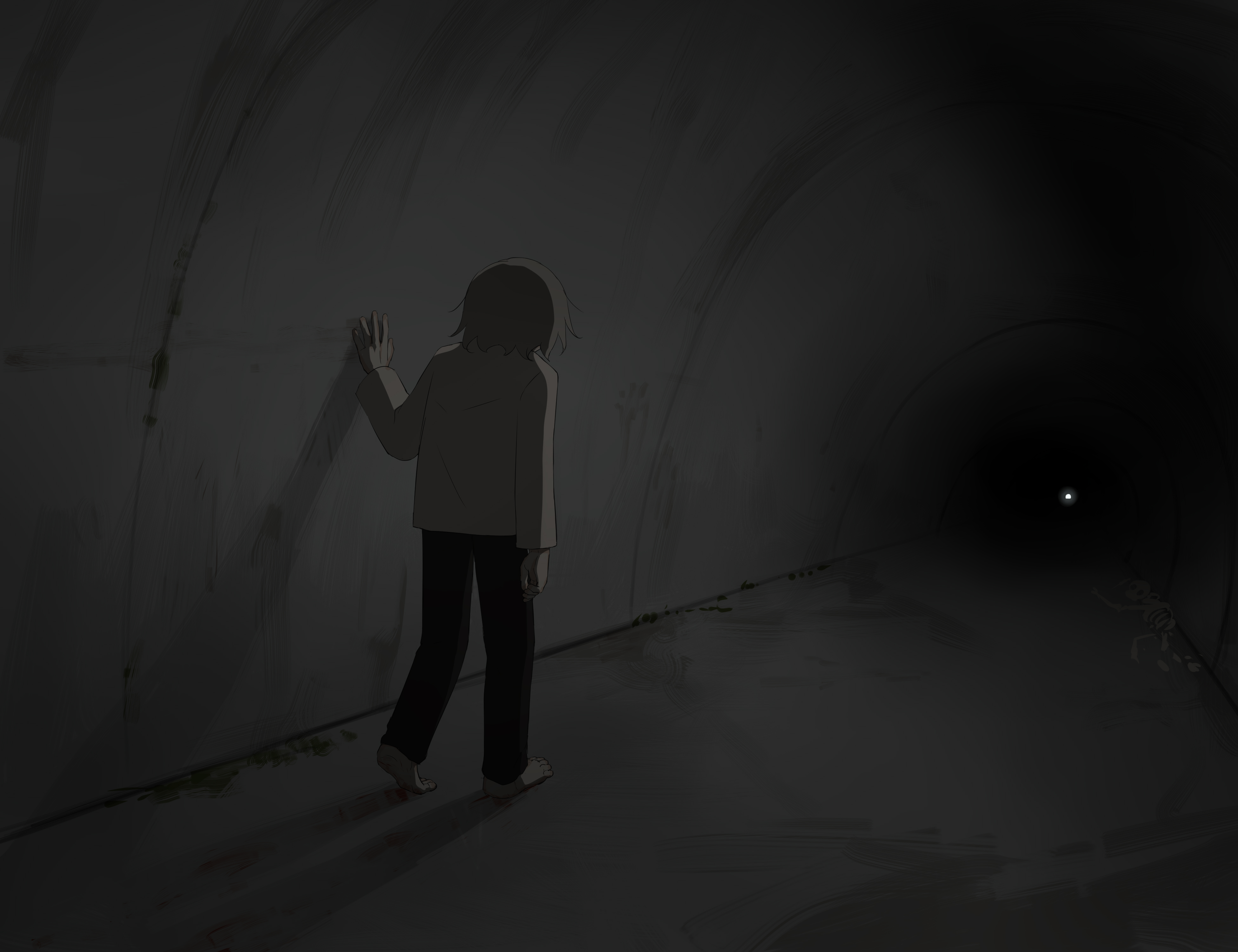 1boy absurdres avogado6 barefoot black_pants commentary_request dark facing_away from_behind grey_hair hand_on_wall highres light long_sleeves medium_hair original pants shirt solo symbolism tunnel vanishing_point walking white_shirt wide_shot