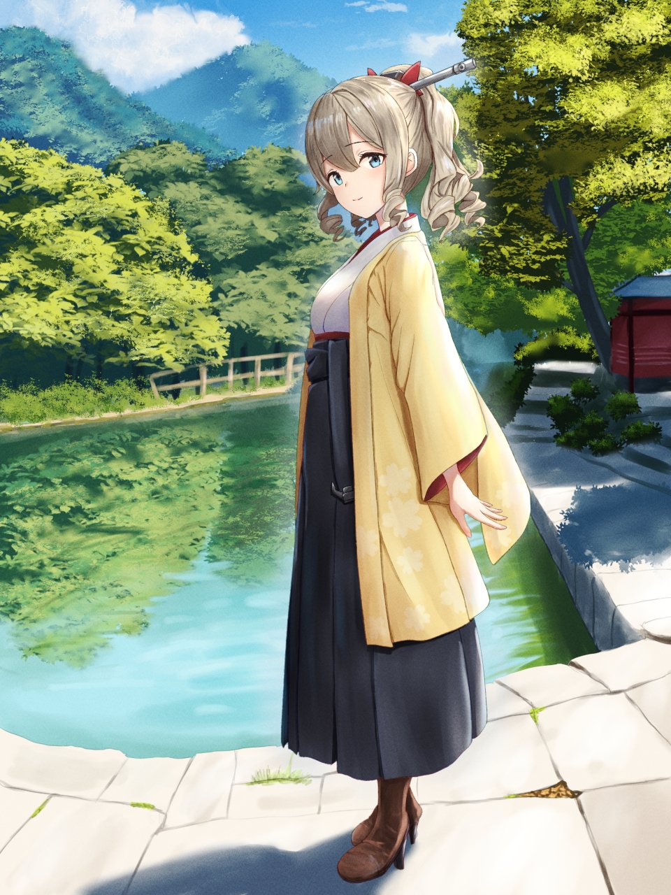 1girl black_hakama black_skirt blue_eyes brown_footwear closed_mouth commentary_request drill_hair from_side full_body hair_between_eyes hair_ornament hair_stick hakama hakama_skirt haori hatakaze_(kancolle) highres japanese_clothes kantai_collection kimono kotou_yogen light_brown_hair long_skirt looking_at_viewer meiji_schoolgirl_uniform outdoors pond ponytail red_ribbon ribbon shadow skirt sky solo tree white_kimono wide_sleeves