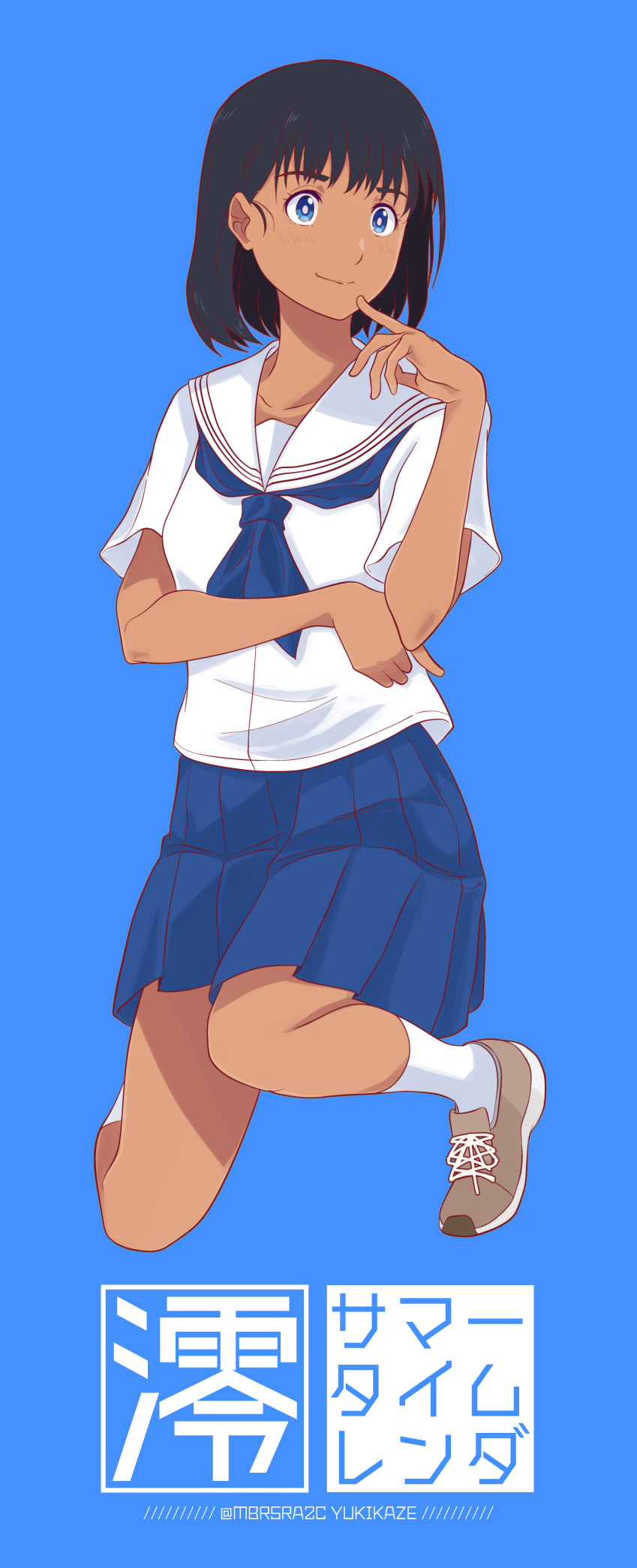 1girl artist_logo black_hair blue_background blue_eyes blue_neckerchief blue_skirt collarbone commentary full_body highres kofune_mio logo looking_to_the_side neckerchief on_one_knee pleated_skirt sailor_collar school_uniform serafuku shirt short_hair simple_background skirt solo summertime_render white_sailor_collar white_shirt yukikaze_(isamiashi)