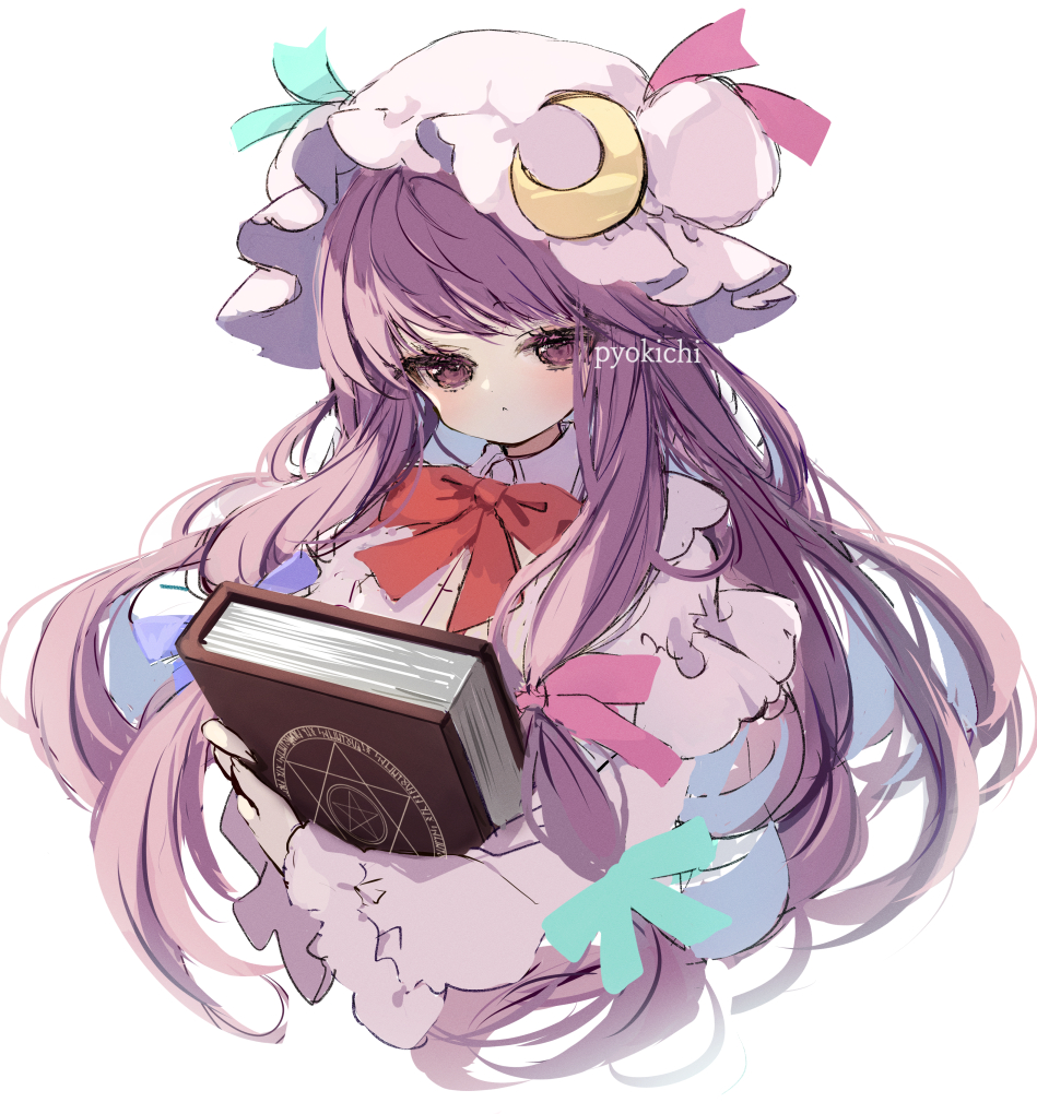 1girl artist_name book closed_mouth commentary crescent crescent_hat_ornament dress frilled_sleeves frills hat hat_ornament holding holding_book long_hair long_sleeves mob_cap patchouli_knowledge piyokichi purple_dress purple_eyes purple_hair purple_hat simple_background solo touhou upper_body white_background wide_sleeves
