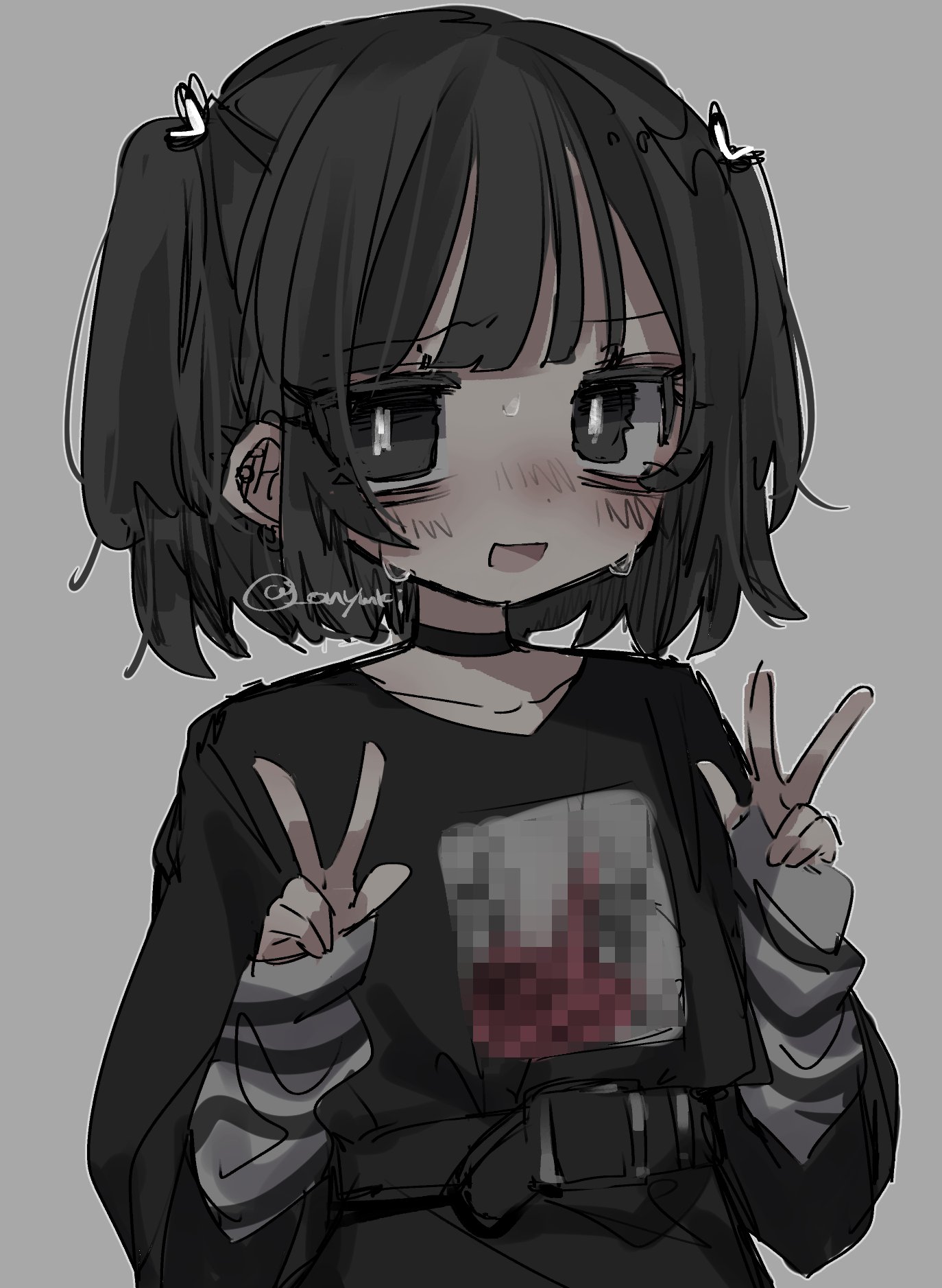 1girl bags_under_eyes belt black_belt black_choker black_eyes black_hair black_shirt blush bright_pupils censored choker collarbone double_w ear_piercing furrowed_brow grey_background hair_ribbon hands_up highres layered_sleeves long_sleeves looking_at_viewer medium_hair mosaic_censoring nervous_smile oniyamakei open_mouth original piercing print_shirt ribbon shirt short_over_long_sleeves short_sleeves simple_background smile solo striped_sleeves sweat twitter_username two_side_up upper_body w white_pupils