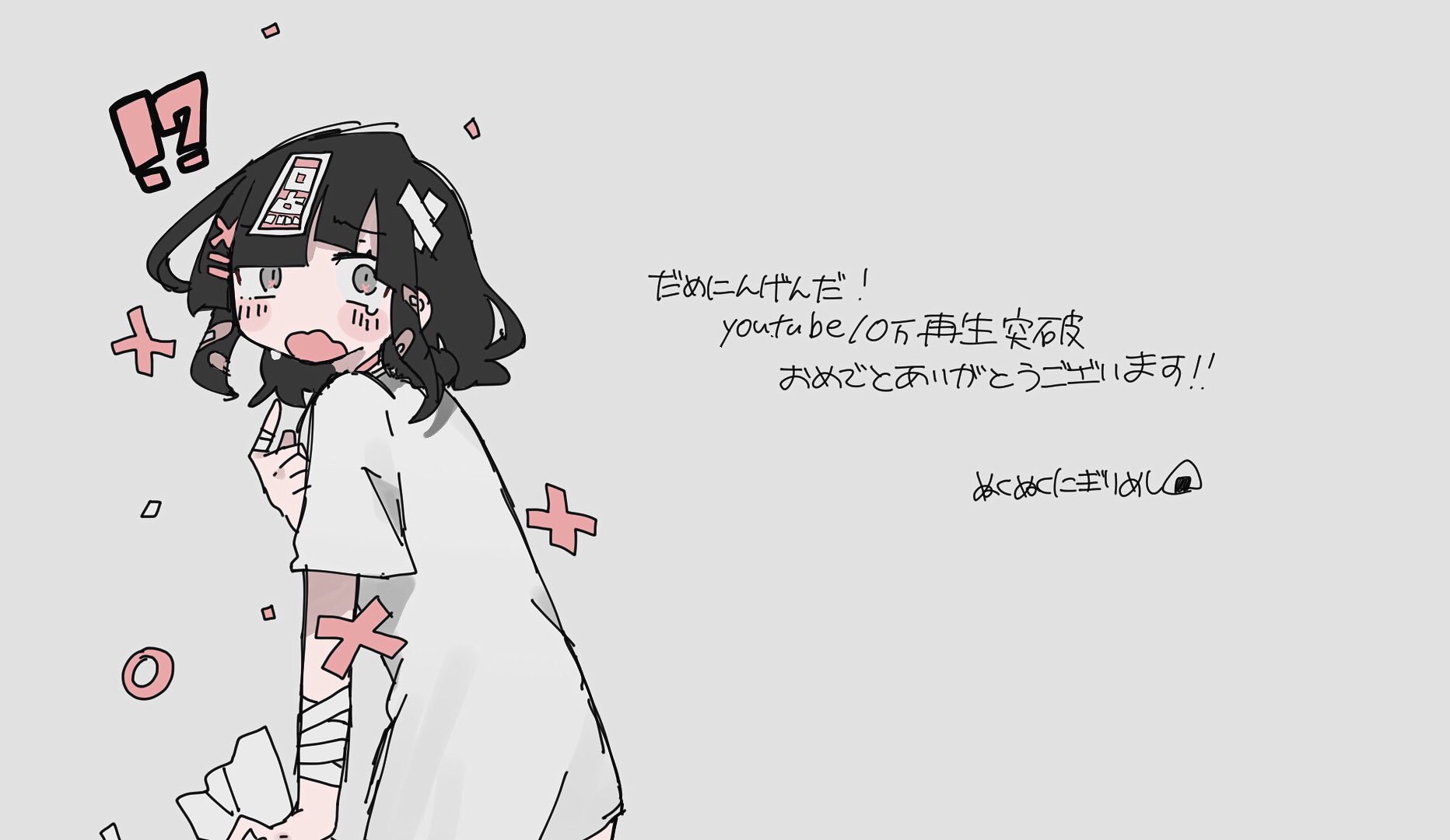 !? 1girl bandaged_arm bandaged_fingers bandages bandaid bandaid_hair_ornament bandaid_on_head black_hair blunt_bangs blush_stickers choker commentary_request crossed_bandaids dame_ningen_da_(utau) from_behind furrowed_brow grey_background grey_eyes grey_shirt hair_ornament hairclip highres holding holding_paper looking_at_viewer looking_back medium_hair milestone_celebration nukunuku_nigirimeshi open_mouth paper pink_choker pointing pointing_at_self shirt short_sleeves simple_background solo surprised tearing_up translation_request wavy_mouth wide-eyed x_(symbol) x_hair_ornament