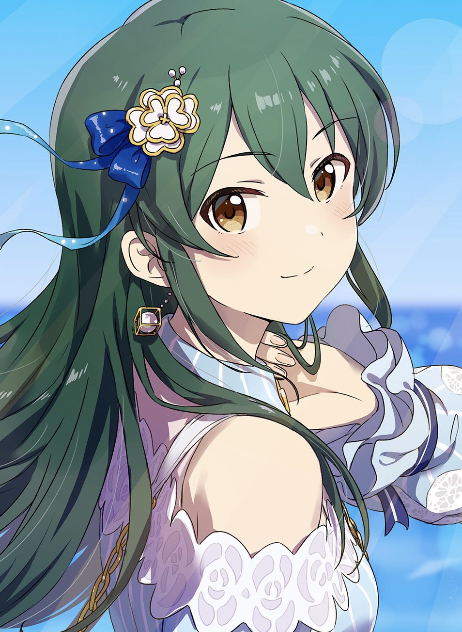 1girl ayano_yuu_(sonma_1426) bare_shoulders blue_ribbon blue_shirt blue_sky blurry blurry_background blush brown_eyes closed_mouth day detached_collar dot_nose earrings from_side green_hair hair_between_eyes hair_ribbon hand_up highres horizon idolmaster idolmaster_million_live! jewelry long_hair looking_at_viewer off-shoulder_shirt off_shoulder ohishi_izumi outdoors raised_eyebrows ribbon shirt sidelocks sky smile solo straight_hair striped_clothes striped_shirt upper_body