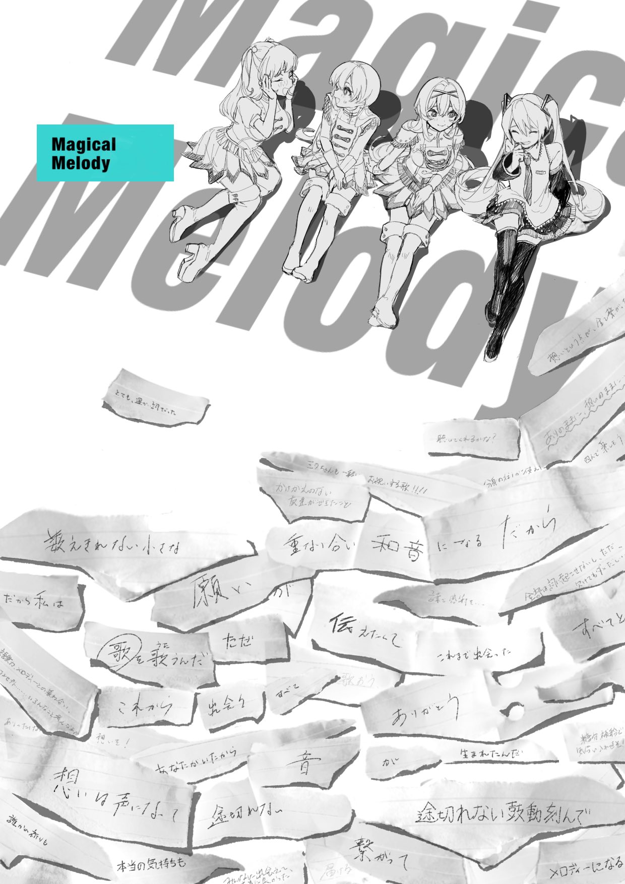 4girls aiguillette arm_at_side arms_between_legs bare_shoulders bawa_(thankyousushi) boots closed_eyes collared_shirt detached_sleeves facing_another facing_viewer frilled_shirt frills fringe_trim full_body greyscale hair_between_eyes hair_intakes hair_ornament hand_up hands_on_own_cheeks hands_on_own_face hatsune_miku highres idoly_pride knee_up long_bangs long_hair long_sleeves looking_at_another lying monochrome multiple_girls necktie okuyama_sumire on_side open_mouth papers photoshop_(medium) pleated_skirt shirt sitting skirt sleeveless sleeveless_shirt smile straight_hair suzumura_yuu tendou_rui thigh_boots thighhighs translation_request trinityaile_(idoly_pride) twintails two_side_up vocaloid wide_shot wrist_cuffs