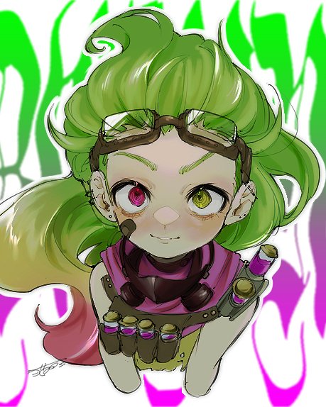 1girl alternate_costume bandaid bandaid_on_cheek bandaid_on_face bottle cropped_torso earrings goggles goggles_on_head green_background green_eyes green_hair heterochromia jewelry league_of_legends long_hair mask multicolored_hair neko-me-kun pink_background pink_eyes respirator solo teeth two-tone_hair white_background zaun_(league_of_legends) zoe_(league_of_legends)