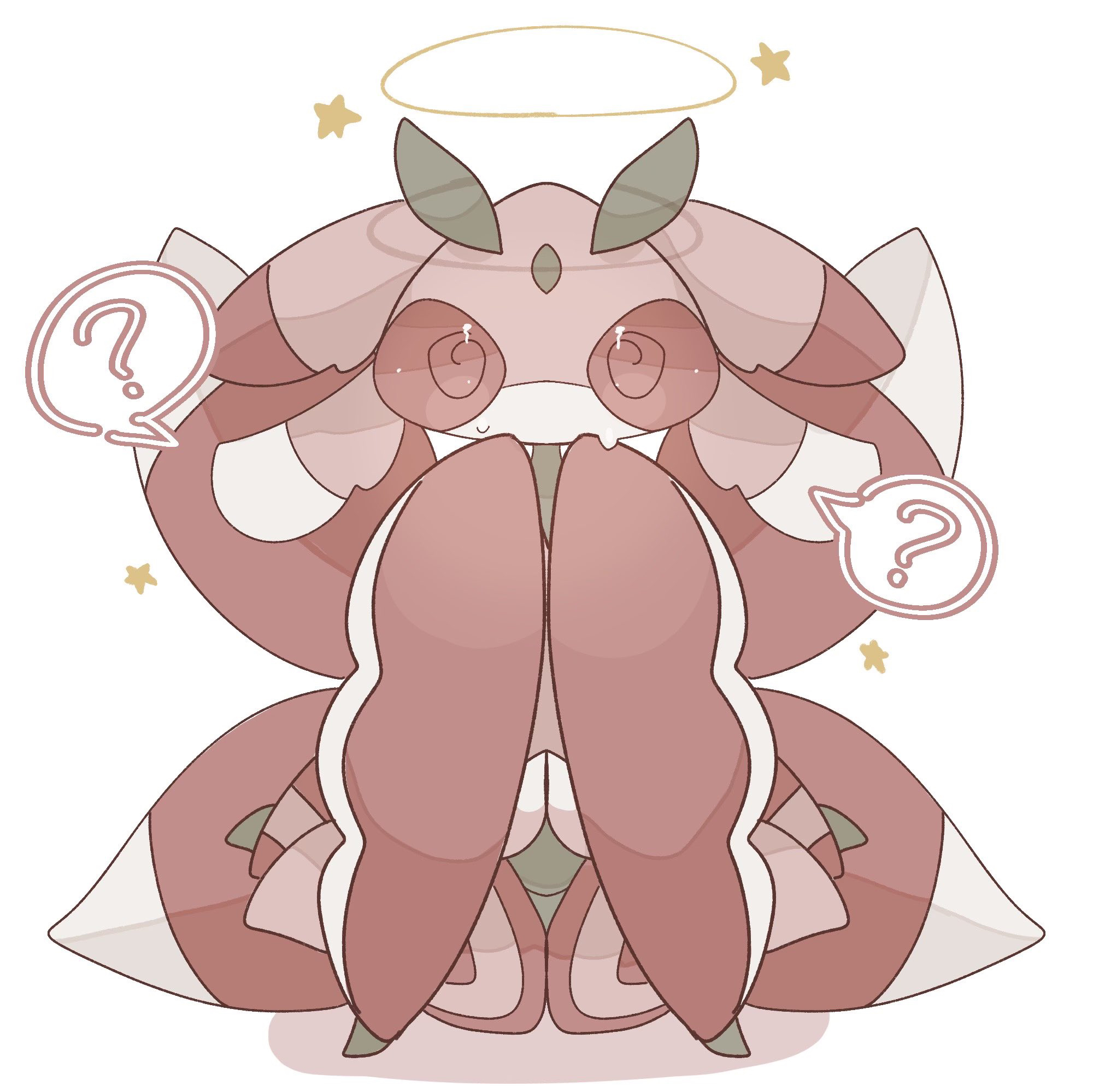 1girl ? @_@ antennae arthropod_girl colored_skin dizzy female_focus full_body gen_7_pokemon halo hands_up highres knees_together_feet_apart looking_at_viewer lurantis multicolored_skin namako_(na_ma_koko) nervous nintendo no_mouth own_hands_together pink_skin pokemon pokemon_(creature) red_eyes simple_background sitting solo speech_bubble spoken_question_mark star_(symbol) straight-on striped_skin sweat wariza white_background white_skin