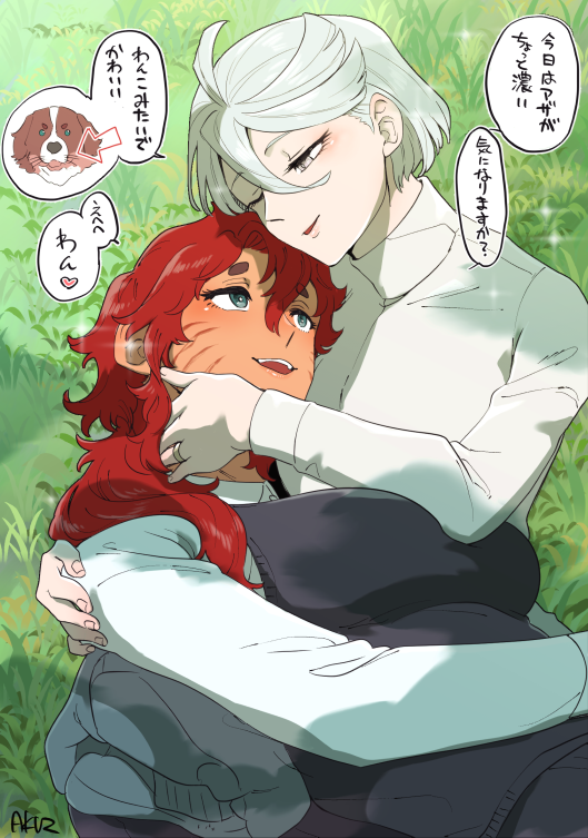 2girls ahoge akutsu_(demodori) breasts day dog grass green_eyes grey_eyes gundam gundam_suisei_no_majo hand_on_another's_face happy jewelry lap_pillow large_breasts long_hair looking_at_another miorine_rembran multiple_girls one_eye_closed outdoors parted_lips red_hair ring shirt signature smile sparkle speech_bubble suletta_mercury teeth translation_request upper_teeth_only wedding_ring white_hair wife_and_wife yuri