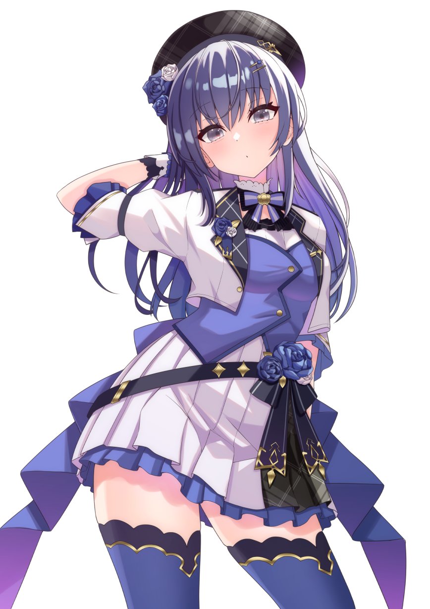 1girl beret black_hat blue_thighhighs colored_inner_hair cropped_jacket grey_hair hat highres idol jacket long_hair multicolored_hair nijisanji official_alternate_costume pleated_skirt ponto_nei ponto_nei_(2nd_costume) purple_hair simple_background skirt solo thighhighs toriniku_(selene1050) virtual_youtuber white_background white_jacket white_skirt