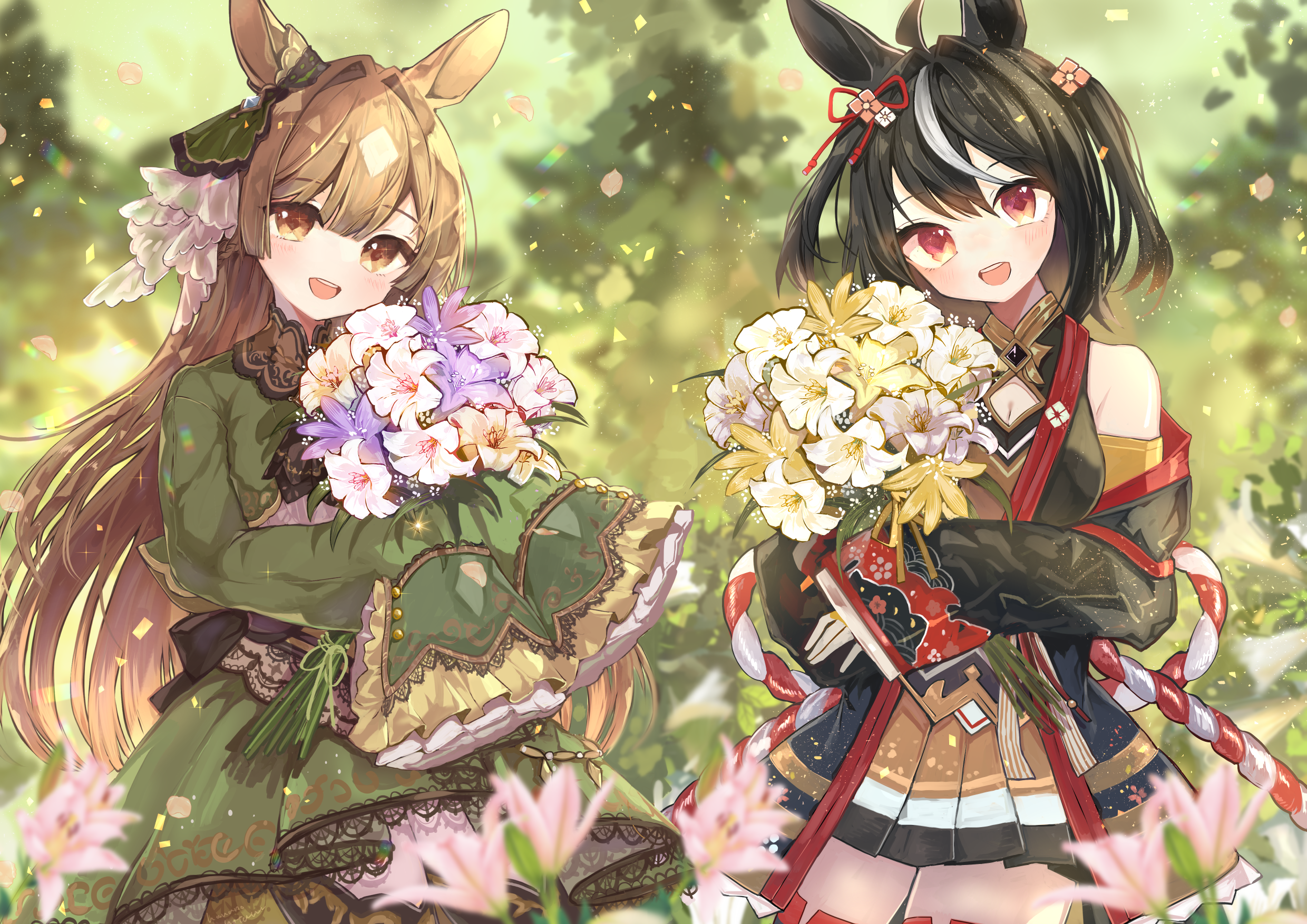 1girl 2girls ahoge animal_ears black_hair bouquet brown_hair commentary ear_ornament flower harunohotaru highres holding holding_bouquet horse_ears horse_girl horse_tail kitasan_black_(umamusume) long_hair looking_at_viewer medium_hair multicolored_hair multiple_girls open_mouth red_eyes satono_diamond_(umamusume) smile solo standing streaked_hair tail umamusume very_long_hair