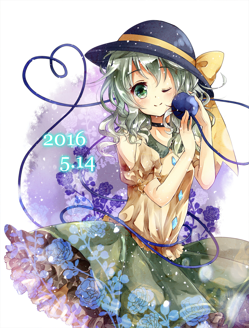 1girl 2016 ;) adapted_costume black_choker black_hat blue_flower blue_rose blush bow breasts buttons choker closed_mouth collar commentary cowboy_shot dated diamond_button eyeball eyelashes floral_print flower frilled_skirt frills green_collar green_eyes green_skirt hair_between_eyes hands_up hat hat_bow heart heart_of_string holding holding_eyeball koishi_day komeiji_koishi medium_hair one_eye_closed puffy_short_sleeves puffy_sleeves rose rose_print sakura_(kasupi) shirt short_sleeves simple_background skirt sleeve_bow small_breasts smile solo standing third_eye touhou wavy_hair white_background yellow_bow yellow_shirt