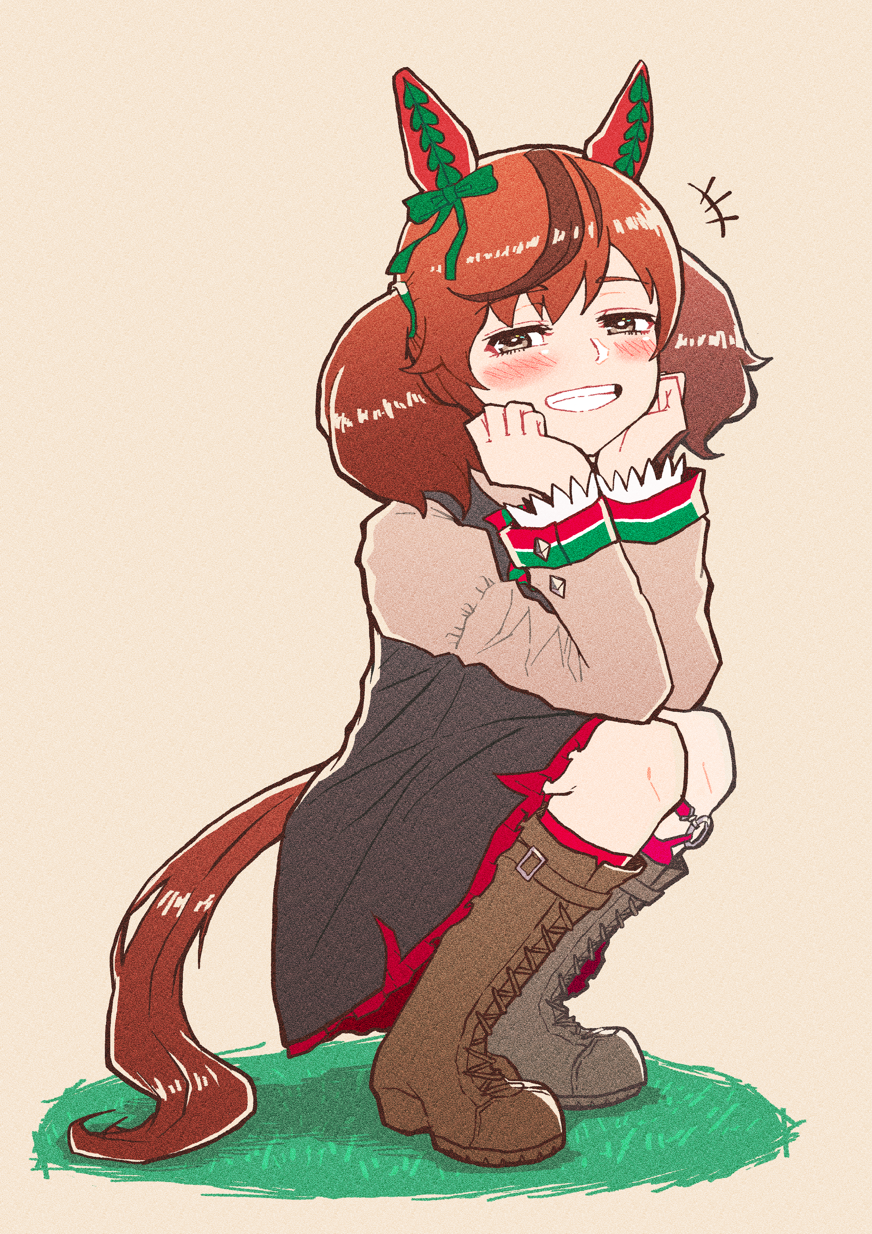 1girl absurdres animal_ears blush boots brown_background brown_eyes commentary_request grass grin hair_between_eyes hair_ornament hands_on_own_cheeks hands_on_own_face highres horse_ears horse_girl horse_tail looking_at_viewer medium_hair nenbutsu_0416 nice_nature_(umamusume) red_hair ribbon simple_background sitting smile solo tail umamusume