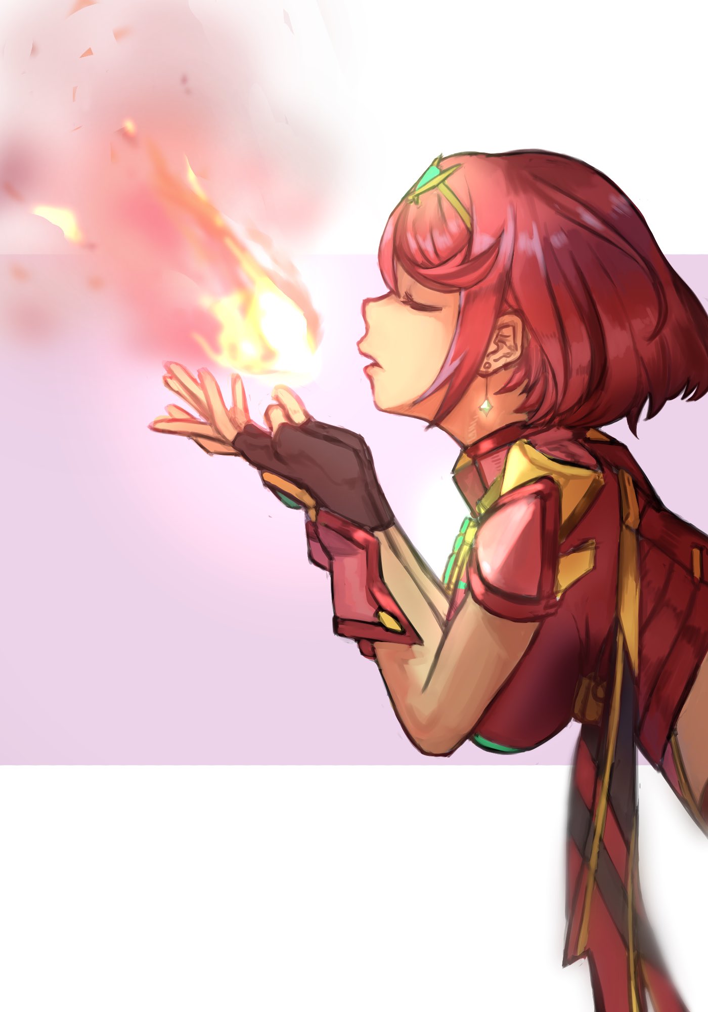 1girl aqua_gem breasts chest_jewel closed_eyes earrings fingerless_gloves fire floating_earrings from_side gem gloves highres jewelry large_breasts leaning_forward pyra_(xenoblade) r123 red_hair short_hair solo swept_bangs tiara xenoblade_chronicles_(series) xenoblade_chronicles_2