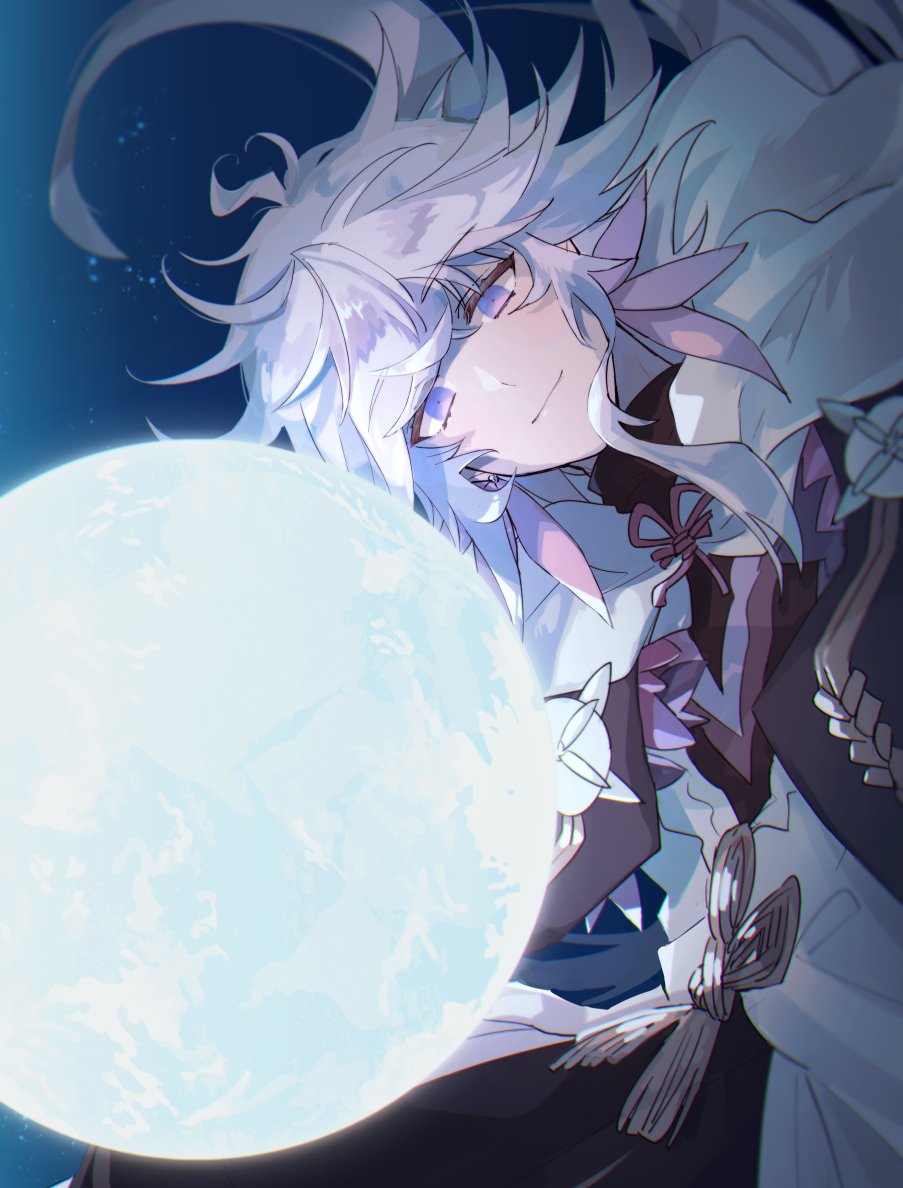 1boy amachi_(yuuin) black_pants black_shirt closed_mouth earrings earth_(planet) fate/grand_order fate_(series) feet_out_of_frame giant glowing hair_between_eyes hood hood_down hooded_robe jewelry long_hair looking_at_object male_focus merlin_(fate) pants planet purple_eyes robe shirt sky smile solo space star_(sky) starry_sky turtleneck white_hair white_robe