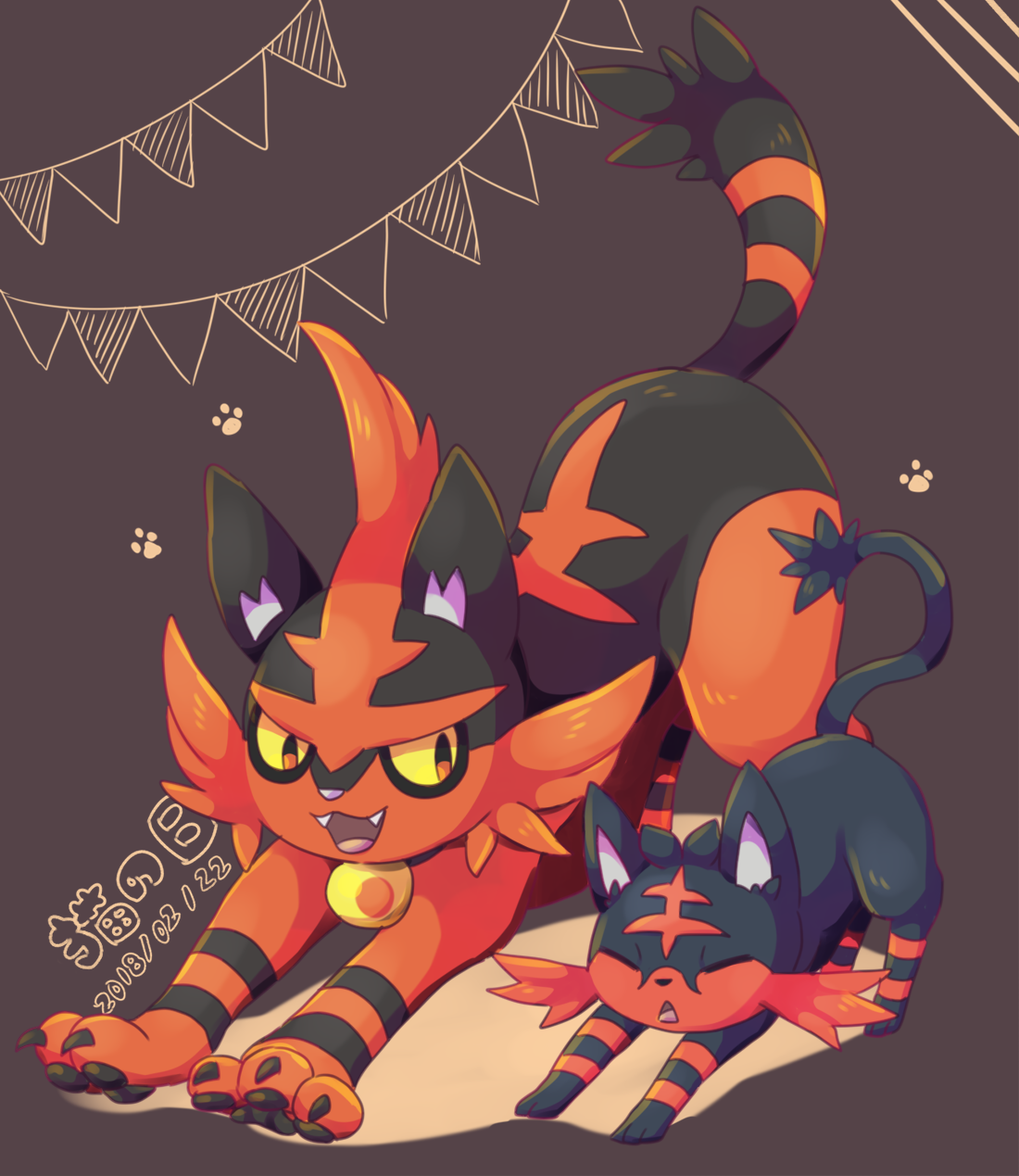 brown_background closed_eyes colored_sclera dated full_body gen_7_pokemon highres kechon-san litten nintendo no_humans open_mouth pokemon pokemon_(creature) stretching torracat yellow_sclera