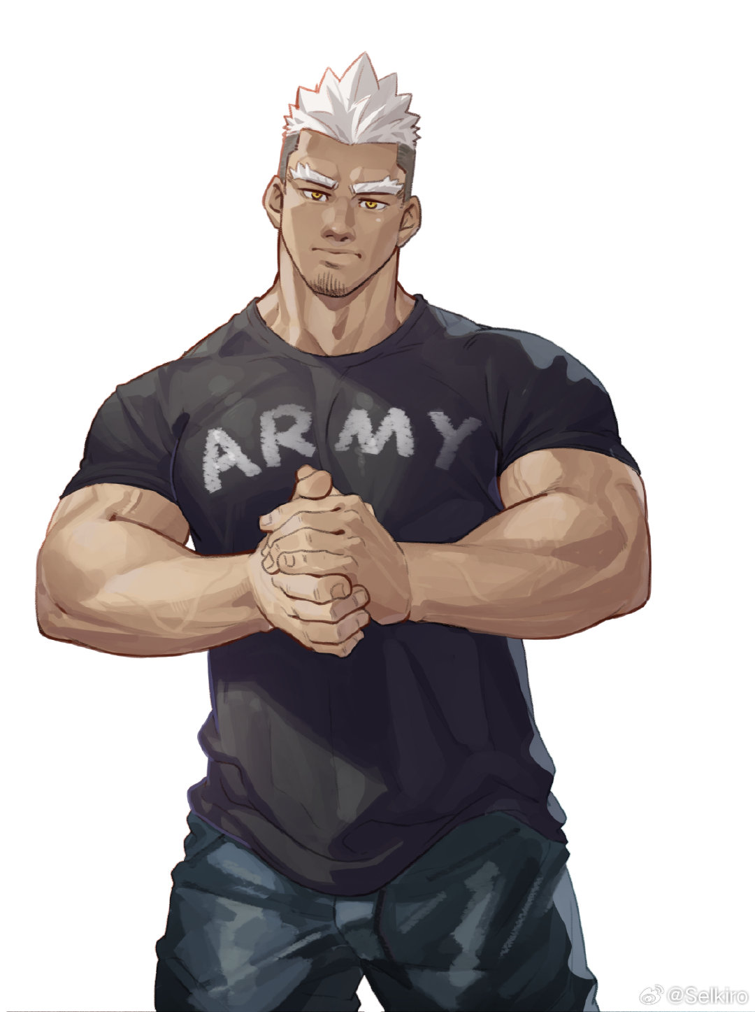 1boy army bara clothes_writing feet_out_of_frame forked_eyebrows frown head_tilt highres large_pectorals looking_at_viewer male_focus mature_male muscular muscular_male original own_hands_together pectorals selkiro shirt solo standing t-shirt thick_eyebrows undercut veins veiny_arms