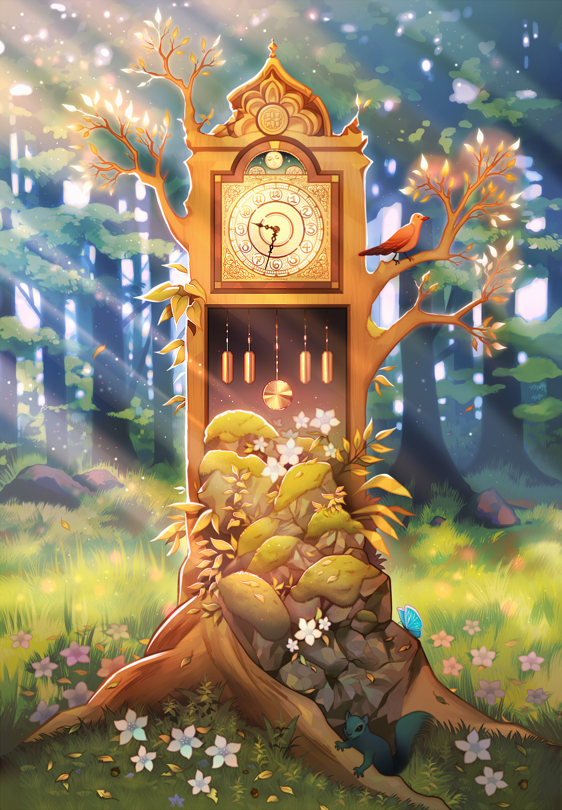 abandoned acorn animal bird blue_butterfly branch bug butterfly clock commentary english_commentary flower forest grandfather_clock grass highres insect leaf light_particles light_rays longestdistance moss nature no_humans original squirrel white_flower