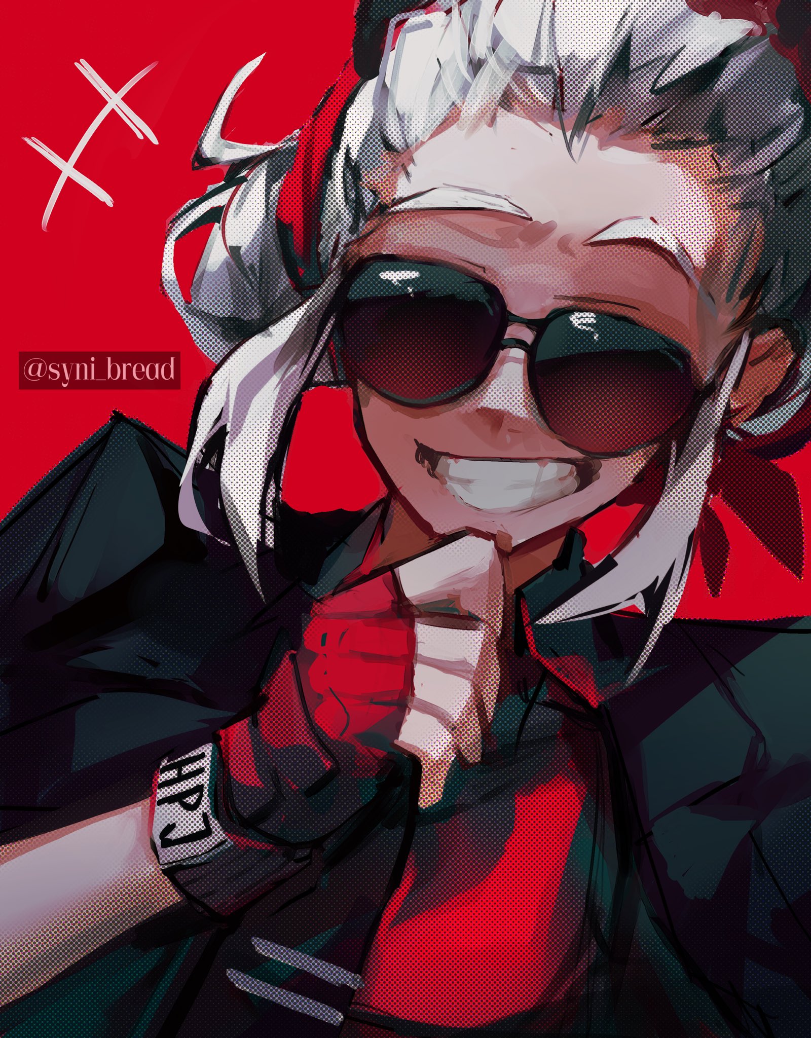 1girl artist_name black_jacket black_necktie collared_shirt fingerless_gloves gloves grey_hair grin hairband hand_on_own_chin hand_up helltaker highres jacket justice_(helltaker) necktie portrait red_background red_gloves red_hairband red_shirt shirt short_hair simple_background smile solo sunglasses synibread teeth