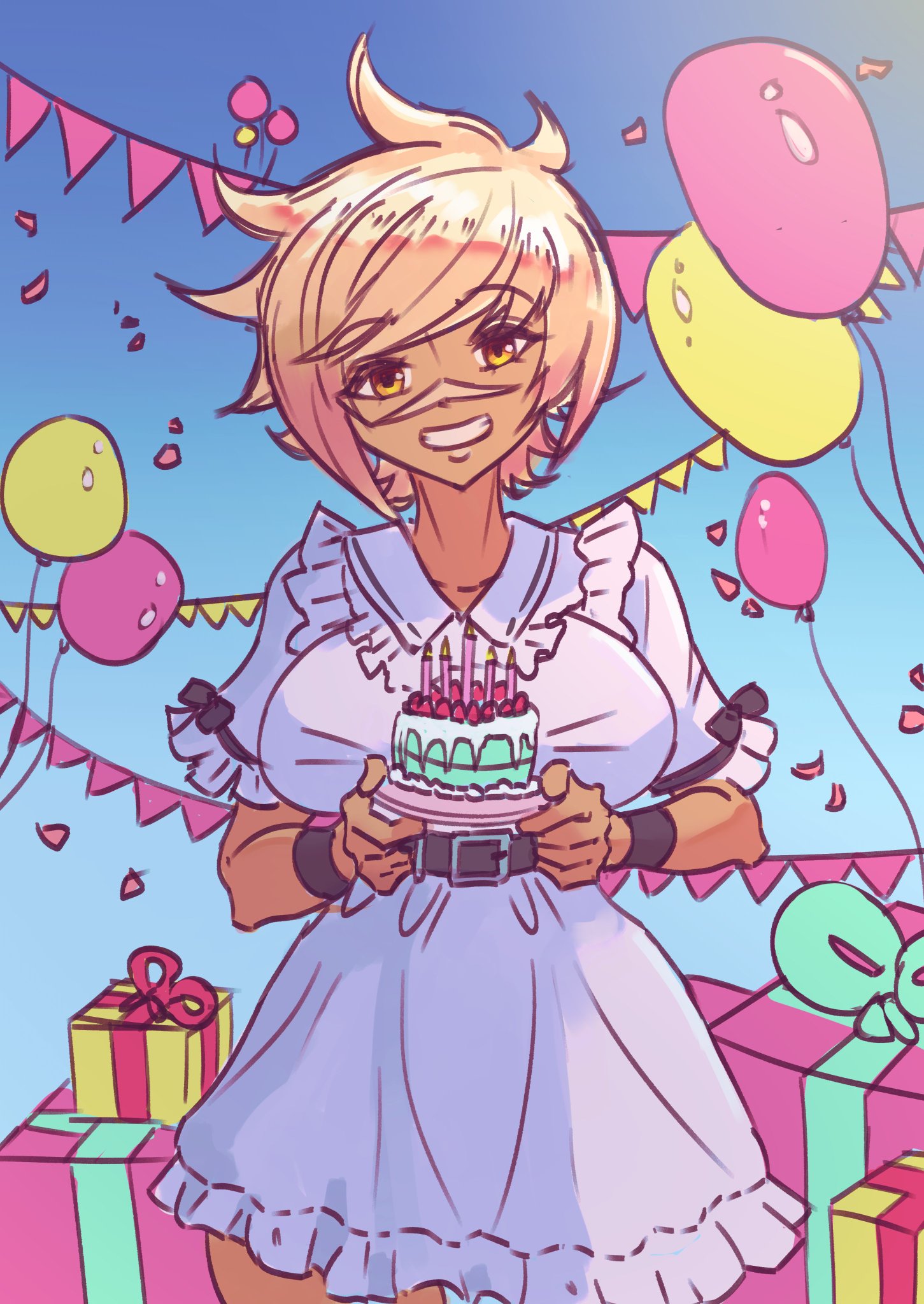 1girl balloon blazblue box breasts bullet_(blazblue) cake dark-skinned_female dark_skin dress food gift gift_box happy_birthday highres large_breasts short_hair taobaka white_hair yellow_eyes