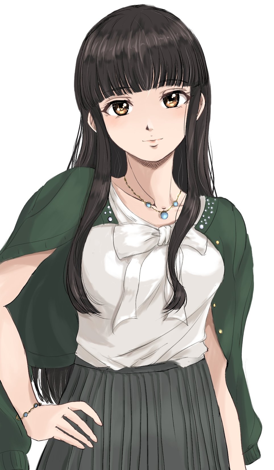 1girl black_hair blunt_bangs blush bow bowtie bracelet breasts brown_eyes closed_mouth collarbone cowboy_shot gatsby_ssl green_jacket grey_skirt hair_over_shoulder hand_on_own_hip highres idolmaster idolmaster_cinderella_girls idolmaster_cinderella_girls_starlight_stage jacket jacket_on_shoulders jewelry kurokawa_chiaki long_hair long_sleeves looking_at_viewer medium_breasts necklace pleated_skirt shirt simple_background skirt smile solo standing white_background white_bow white_bowtie white_shirt