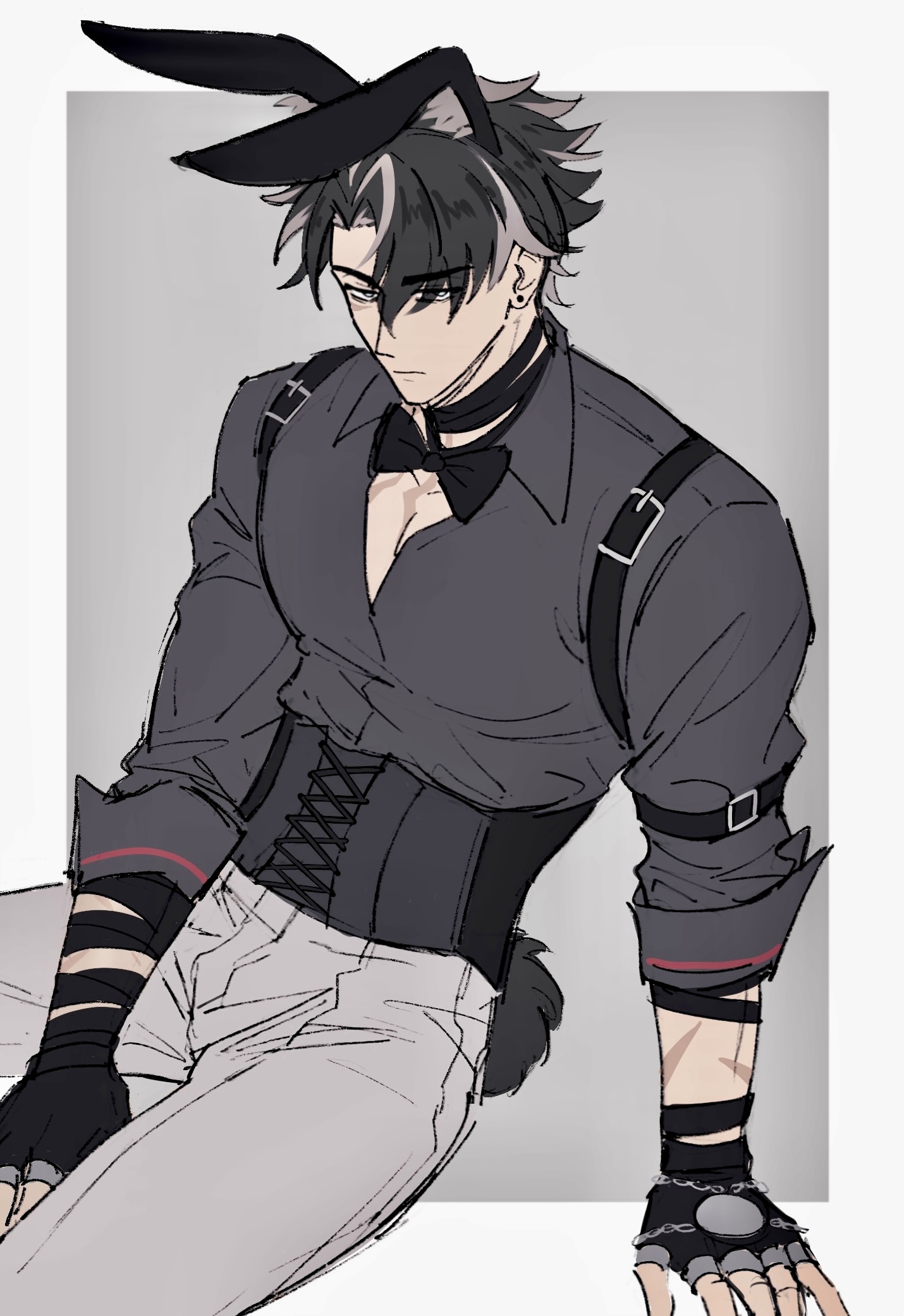 1boy acupofbread animal_ears arm_strap between_legs black_bow black_bowtie black_hair bow bowtie buckle collared_shirt corset cowboy_shot earrings fake_animal_ears fake_tail fingerless_gloves genshin_impact gloves grey_eyes grey_shirt hand_between_legs highres jewelry male_focus multicolored_hair partially_unbuttoned pectoral_cleavage pectorals rabbit_ears rabbit_tail scar scar_on_arm shirt short_hair shoulder_strap sitting sleeves_rolled_up solo spiked_hair streaked_hair stud_earrings tail two-tone_background wriothesley_(genshin_impact)
