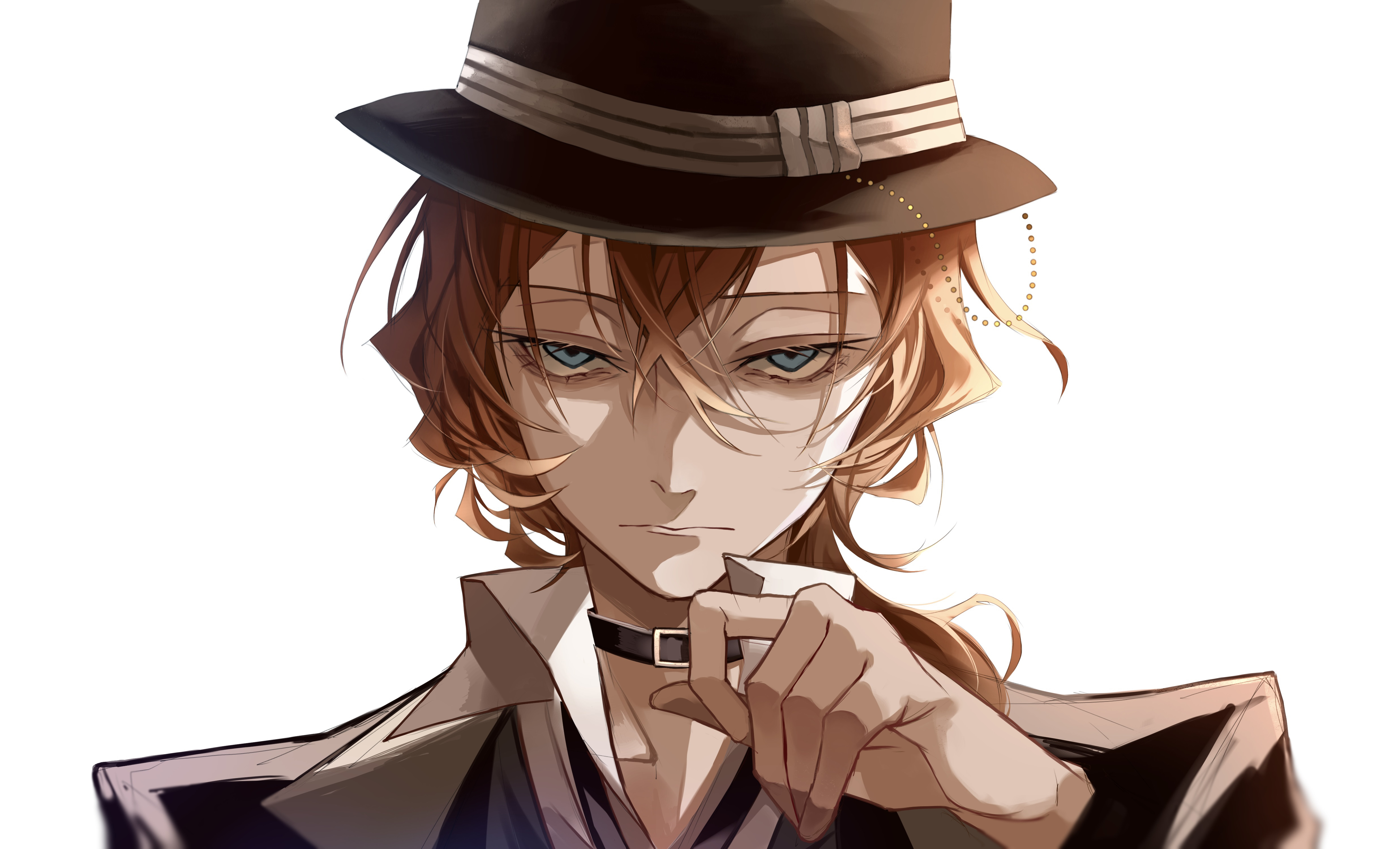 1boy absurdres belt belt_collar black_belt black_hat black_jacket black_necktie black_suit blue_eyes bungou_stray_dogs closed_mouth collar collared_shirt expressionless formal_clothes hair_between_eyes hat highres jacket long_sleeves looking_at_viewer mafia male_focus medium_hair nakahara_chuuya necktie orange_hair shirt sidelocks simple_background solo suit upper_body user_wjpu7573 white_background white_shirt