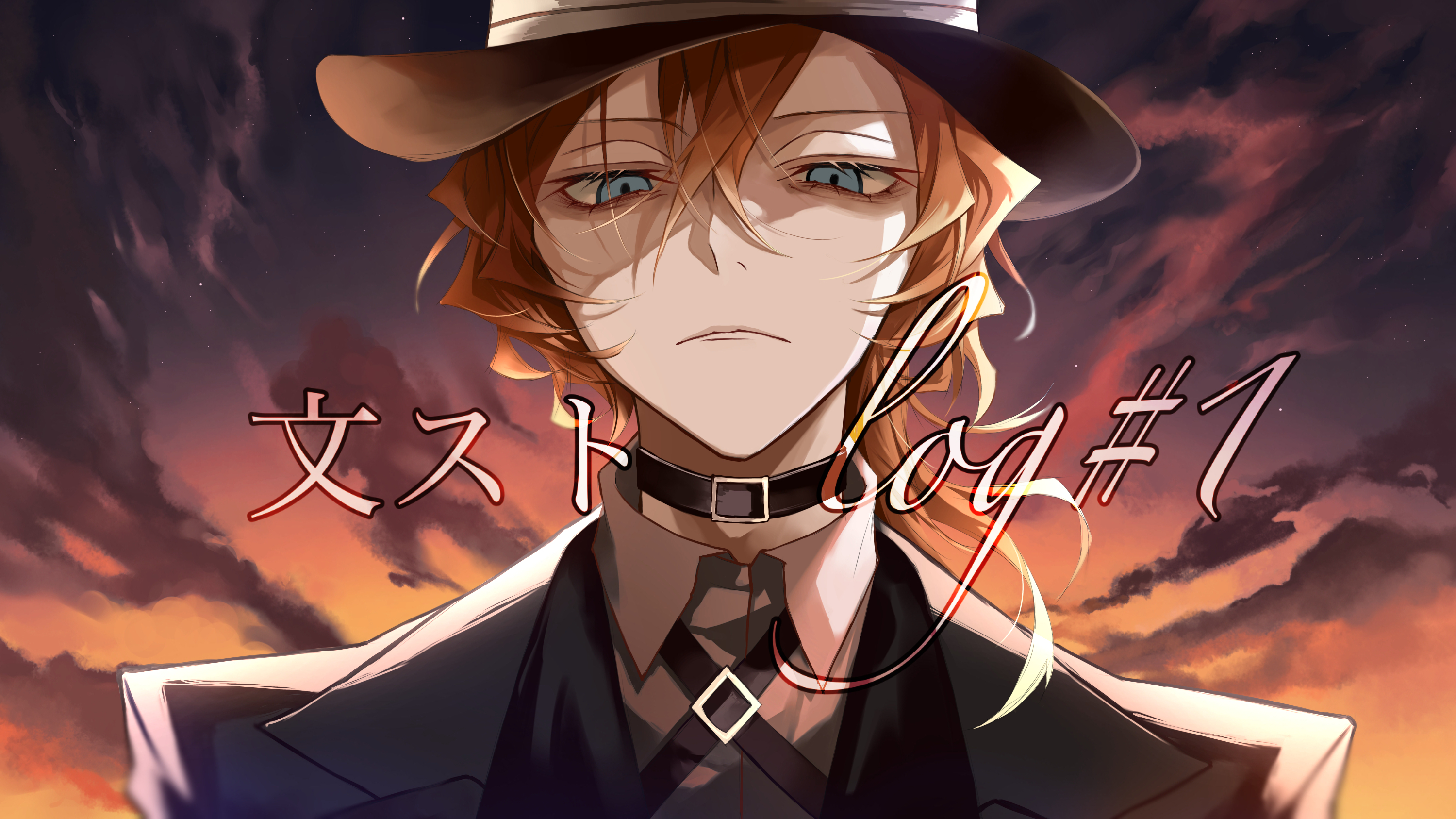 1boy archaic_japanese_text belt belt_collar black_belt black_hat black_jacket black_suit blue_eyes bungou_stray_dogs closed_mouth cloud collar collared_shirt dappled_sunlight expressionless formal_clothes hair_between_eyes hat highres jacket looking_at_viewer mafia male_focus medium_hair nakahara_chuuya orange_hair outdoors shirt sidelocks sky solo suit sunlight sunset upper_body user_wjpu7573 white_shirt