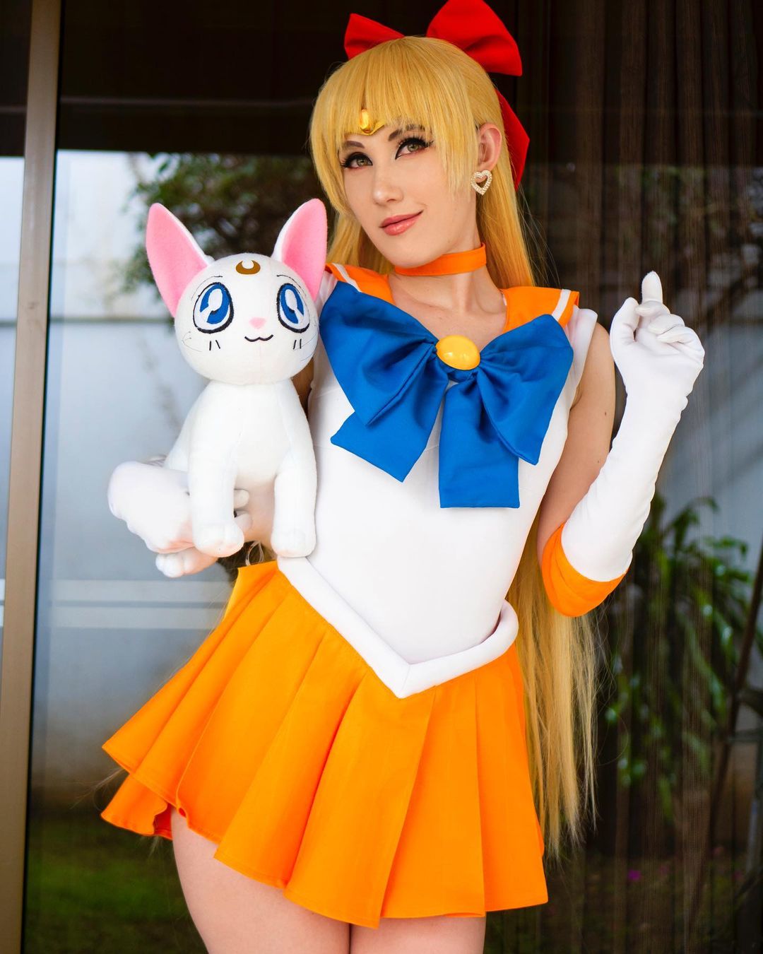 1girl aino_minako artemis_(sailor_moon) bishoujo_senshi_sailor_moon blonde_hair breasts cat cosplay costa_rican_(nationality) earrings gloves highres jewelry long_hair medium_breasts miniskirt molecularagatha photo_(medium) sailor_venus sailor_venus_(cosplay) skirt sleeveless stuffed_toy very_long_hair window