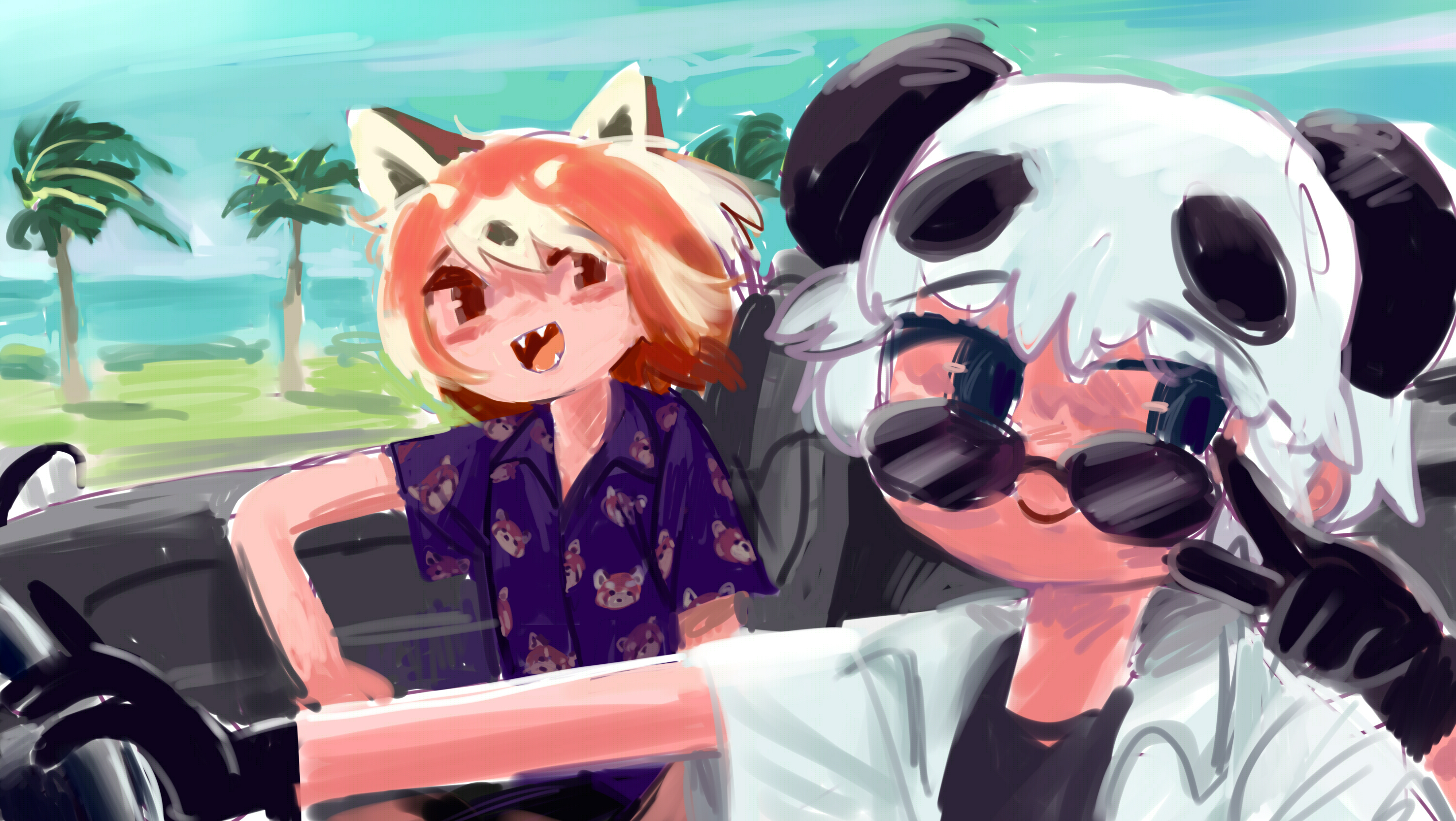 2girls adjusting_eyewear alternate_costume animal_ears animal_print black_eyes black_gloves black_hair black_shirt blue_shirt blue_sky blush brown_eyes car cat closed_mouth commentary_request convertible day dress_shirt driving elbow_rest fangs floating_hair giant_panda_(kemono_friends) gloves hand_up hawaiian_shirt highres index_finger_raised kemono_friends layered_shirt lesser_panda_(kemono_friends) looking_at_viewer looking_over_eyewear looking_to_the_side motor_vehicle multicolored_hair multiple_girls no_pupils no_sclera open_clothes open_mouth open_shirt orange_hair outdoors outstretched_arm palm_tree panda_ears panda_girl pero_(sabuaka_bacon) raised_eyebrows red_panda_ears red_panda_girl shirt short_hair sitting sky smile steering_wheel sunglasses tree white_hair white_shirt