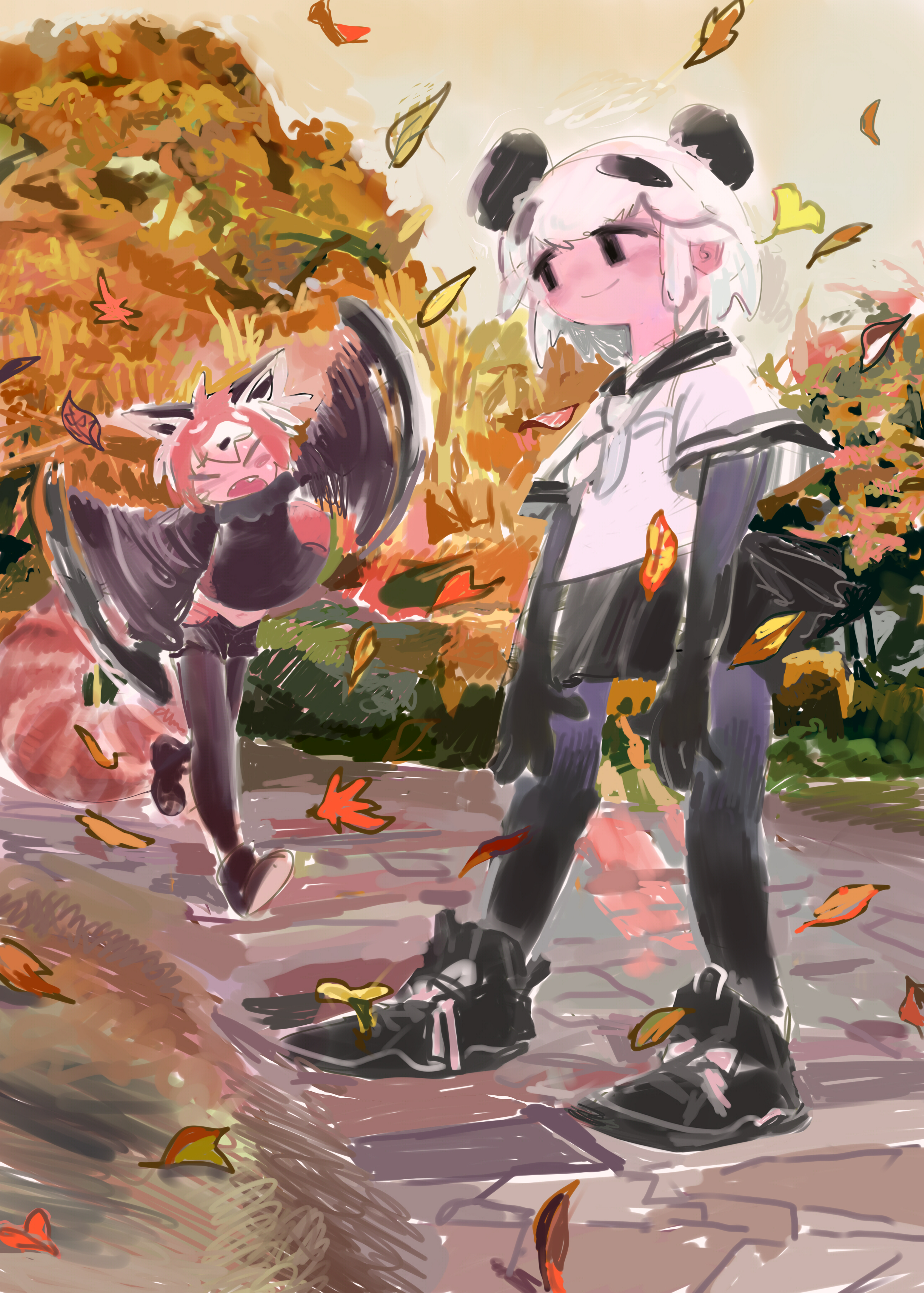 2girls absurdres animal_ears autumn_leaves black_eyes black_footwear black_gloves black_hair black_pantyhose black_sailor_collar black_shirt black_shorts blush boots commentary_request day elbow_gloves falling_leaves fangs flailing giant_panda_(kemono_friends) gloves highres kemono_friends leaf lesser_panda_(kemono_friends) looking_at_another midriff_peek multicolored_hair multiple_girls navel neckerchief no_sclera open_mouth orange_hair outdoors panda_ears panda_girl pantyhose path pero_(sabuaka_bacon) raised_eyebrows red_panda_ears red_panda_girl red_panda_tail road running sailor_collar school_uniform serafuku shirt short_hair short_shorts short_sleeves shorts smear_frame smile standing streaked_hair tree white_hair white_neckerchief white_shirt