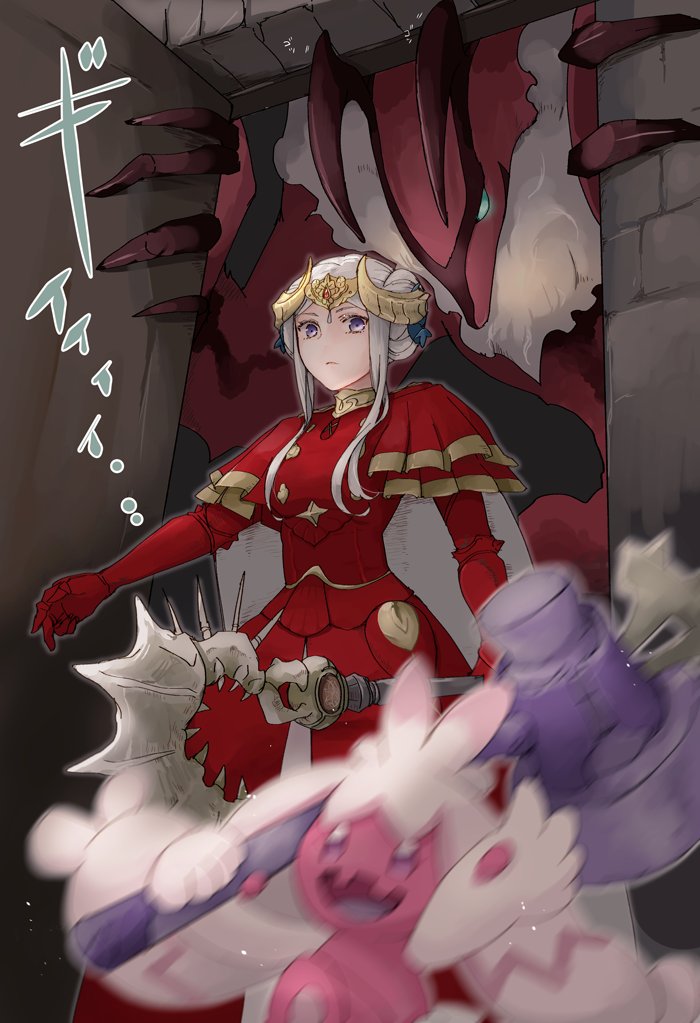 1girl aymr_(fire_emblem) cape double_bun dress edelgard_von_hresvelg edelgard_von_hresvelg_(timeskip) fake_horns fire_emblem fire_emblem:_three_houses gen_6_pokemon gloves hair_bun hammer horns legendary_pokemon nintendo pokemon pokemon_(creature) purple_eyes red_dress red_gloves robaco tinkaton white_hair yveltal