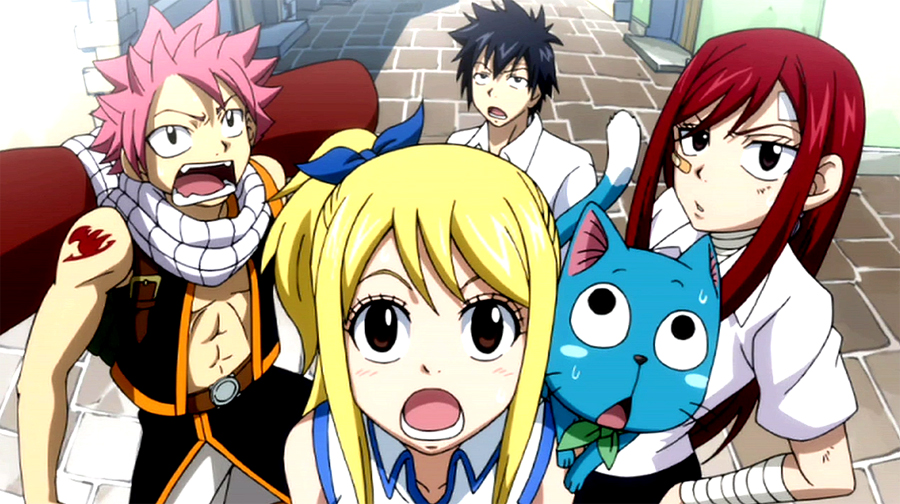 2boys 2girls anime_screenshot black_hair blonde_hair brown_eyes cat erza_scarlet fairy_tail gray_fullbuster happy_(fairy_tail) looking_at_viewer lucy_heartfilia multiple_boys multiple_girls natsu_dragneel open_mouth pink_hair red_hair surprised sweatdrop tattoo teeth