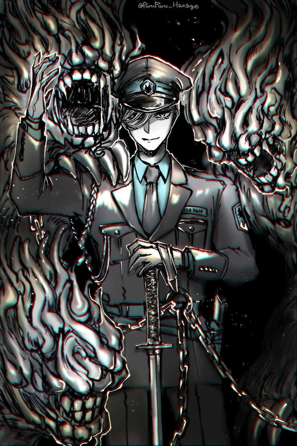 1boy aiguillette alternate_costume aqua_shirt black_background black_hair black_hat black_jacket black_necktie black_pants breast_pocket chain chain_leash collared_shirt cowboy_shot fate/grand_order fate_(series) gloves hair_over_one_eye hand_on_hilt hat highres holding holding_leash jacket katana lapels leash looking_at_viewer male_focus monster necktie notched_lapels pale_skin pants peaked_cap pocket purple_eyes purupuru_hanage security_guard shirt short_hair sleeve_cuffs smile solo soul_eater_(fate) straight-on sword uniform weapon white_gloves yamanami_keisuke_(fate)