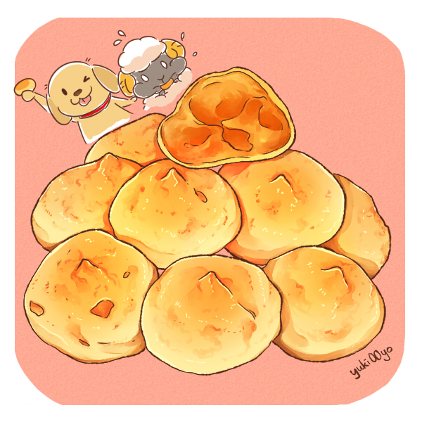 0_0 :3 animal arm_up artist_name black_eyes border chibi chibi_inset closed_mouth collar cream_puff cross-section dessert dog dog_(yuki00yo) eating flying_sweatdrops food food_focus happy holding holding_food looking_at_viewer no_humans one_eye_closed original outstretched_arm red_background sheep sheep_(yuki00yo) signature simple_background smile solid_oval_eyes tongue tongue_out white_border white_eyes wink yuki00yo