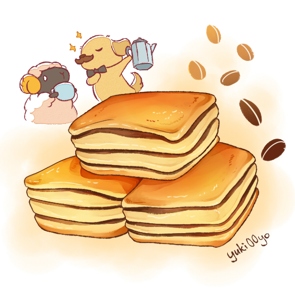 0_0 animal arm_up artist_name black_bow black_bowtie bow bowtie chibi chibi_inset closed_eyes coffee_beans coffee_pot cup dessert dog dog_(yuki00yo) facial_hair food food_focus hand_on_own_chest hand_up holding holding_coffee_pot holding_cup looking_at_another mug mustache no_humans orange_background original outstretched_arm sheep sheep_(yuki00yo) signature sparkle traditional_bowtie u_u white_eyes yuki00yo