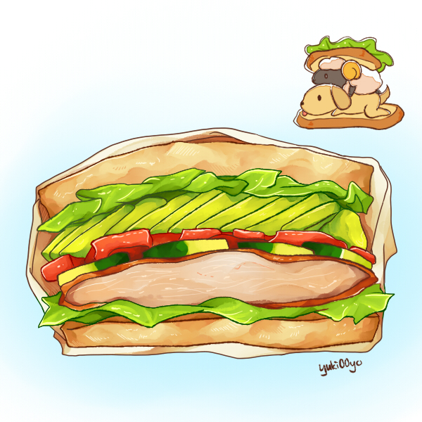 0_0 animal artist_name avocado black_eyes blue_background bread chibi chibi_inset chicken_(food) cross-section cucumber cucumber_slice dog dog_(yuki00yo) food food_focus from_side in_food lettuce lying no_humans on_stomach original paper profile sandwich sheep sheep_(yuki00yo) signature simple_background solid_oval_eyes tomato tomato_slice tongue tongue_out yuki00yo