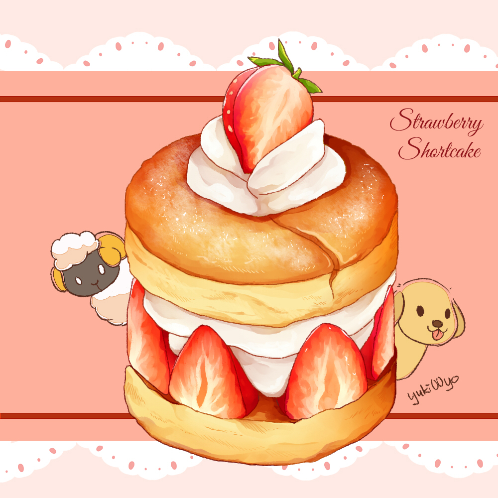 0_0 :3 animal artist_name black_eyes cake chibi chibi_inset closed_mouth cream dessert dog dog_(yuki00yo) english_text food food_focus food_name fruit happy looking_at_viewer no_humans original peeking_out pink_background sheep sheep_(yuki00yo) signature smile solid_oval_eyes strawberry strawberry_shortcake tongue tongue_out white_eyes yuki00yo