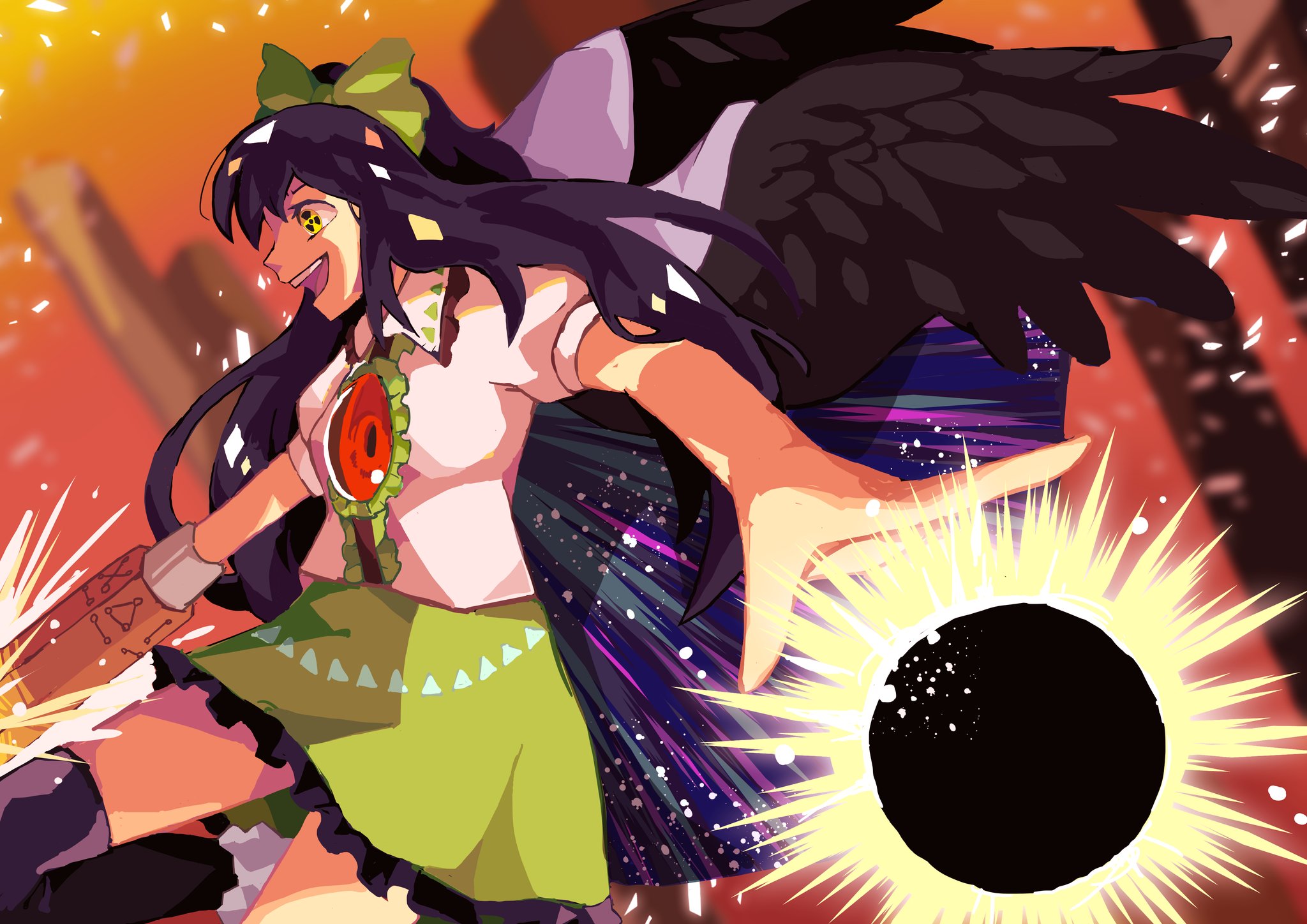 1girl arm_cannon black_hole black_thighhighs black_wings bow brown_hair cape center_frills collared_shirt commentary_request extra_eyes eyelashes feathered_wings fiery_background fire frilled_shirt_collar frilled_skirt frills gradient_background green_bow green_skirt hair_bow highres incoming_attack korean_commentary long_hair miniskirt open_mouth orange_background outstretched_arm pillar ponytail puffy_short_sleeves puffy_sleeves red_background reiuji_utsuho shirt short_sleeves sign skirt smile space_print star_(sky) starry_sky_print teeth thighhighs touhou upper_teeth_only waiwa_way warning_sign warning_sign_eyes weapon white_cape white_shirt wings