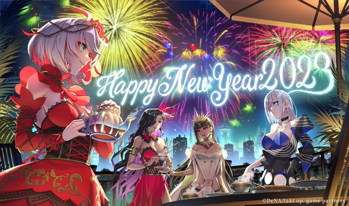 4girls ahoge black_hair blue_dress blue_eyes carmen_(takt_op.) city destiny_(takt_op.) dress fireworks long_hair moonlight_(takt_op.) multicolored_hair multiple_girls night official_art purple_hair red_dress red_hair short_hair sky smile takt_op. takt_op._symphony two-tone_hair very_long_hair white_dress white_hair yellow_eyes