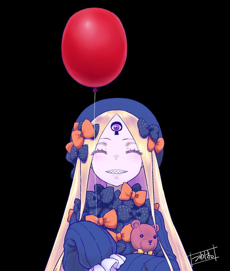 1girl abigail_williams_(fate) abigail_williams_(first_ascension)_(fate) balloon beret black_background black_dress black_hat blonde_hair blush bow closed_eyes dress fate/grand_order fate_(series) forehead grin hair_bow hat holding holding_stuffed_toy keyhole long_hair long_sleeves minazuki_tsuyuha multiple_hair_bows orange_bow parted_bangs polka_dot polka_dot_bow sharp_teeth simple_background sleeves_past_fingers sleeves_past_wrists smile solo stuffed_animal stuffed_toy teddy_bear teeth third_eye