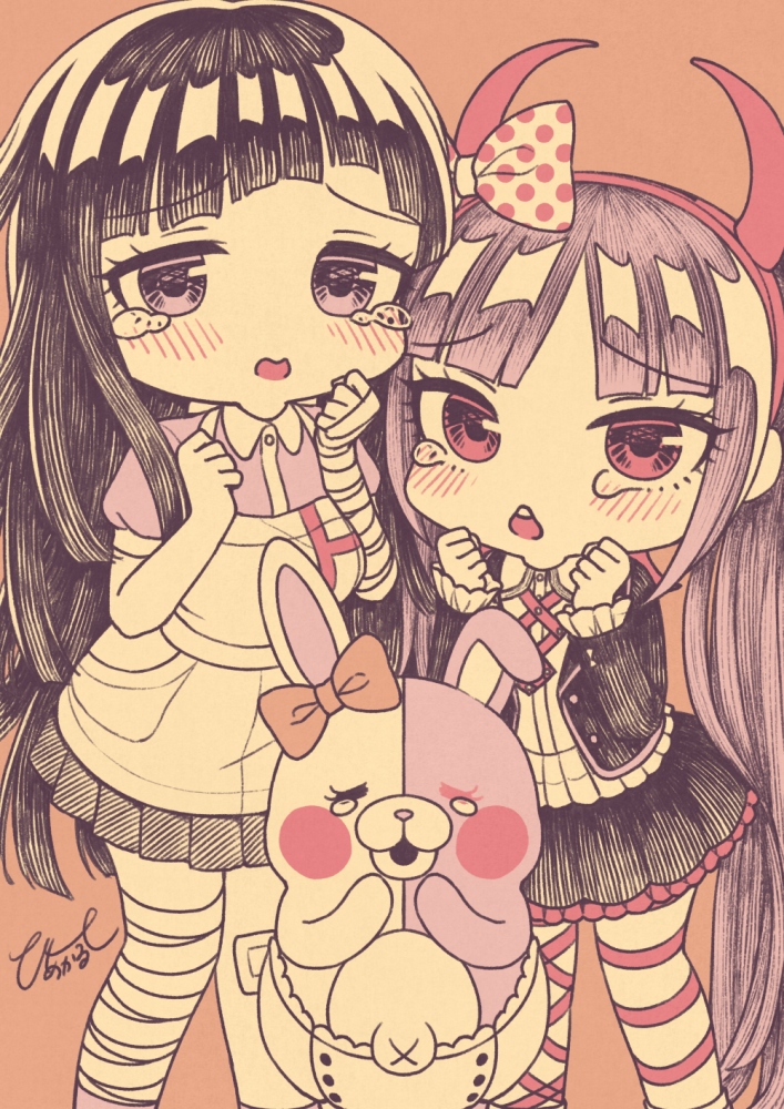 2girls age_difference apron arms_up bandaged_arm bandaged_leg bandages black_dress black_hair blush bow breasts chibi child crying danganronpa_(series) danganronpa_2:_goodbye_despair danganronpa_another_episode:_ultra_despair_girls dress ears eyebrows eyelashes fake_horns hair_bow hairband horned_headwear horns long_hair looking_at_viewer matching_hair/eyes multiple_girls nurse open_mouth pink_background pink_eyes pink_footwear pink_hair pink_hairband pink_headwear pink_shirt pleated_dress pleated_skirt polka_dot polka_dot_bow purple_eyes shirt simple_background skirt small_breasts standing stuffed_animal stuffed_rabbit stuffed_toy teeth thighhighs tsumiki_mikan uneven_bangs upper_teeth_only usami_(danganronpa) utsugi_kotoko white_apron white_footwear