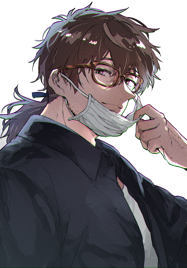 1boy beard_stubble bespectacled black_jacket blue_ribbon brown_hair chromatic_aberration closed_mouth facial_hair fate/grand_order fate_(series) glasses grey_eyes hair_between_eyes hector_(fate) hector_(sheep_counting_lullaby)_(fate) jacket long_hair male_focus mask mask_pull messy_hair mouth_mask ponytail ribbon shirt solo stubble tumikilondon5 upper_body white_background white_mask white_shirt