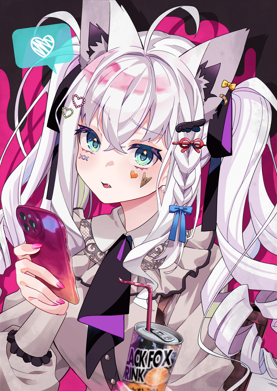 1girl animal_ear_fluff animal_ears braid can comiket_102 commentary_request earrings fox_ears fox_girl gezerun green_eyes grey_shirt hair_between_eyes hair_ornament highres holding holding_can holding_phone hololive jewelry long_hair looking_at_viewer open_mouth phone pink_nails shirakami_fubuki shirt sidelocks single_braid solo twintails virtual_youtuber white_hair