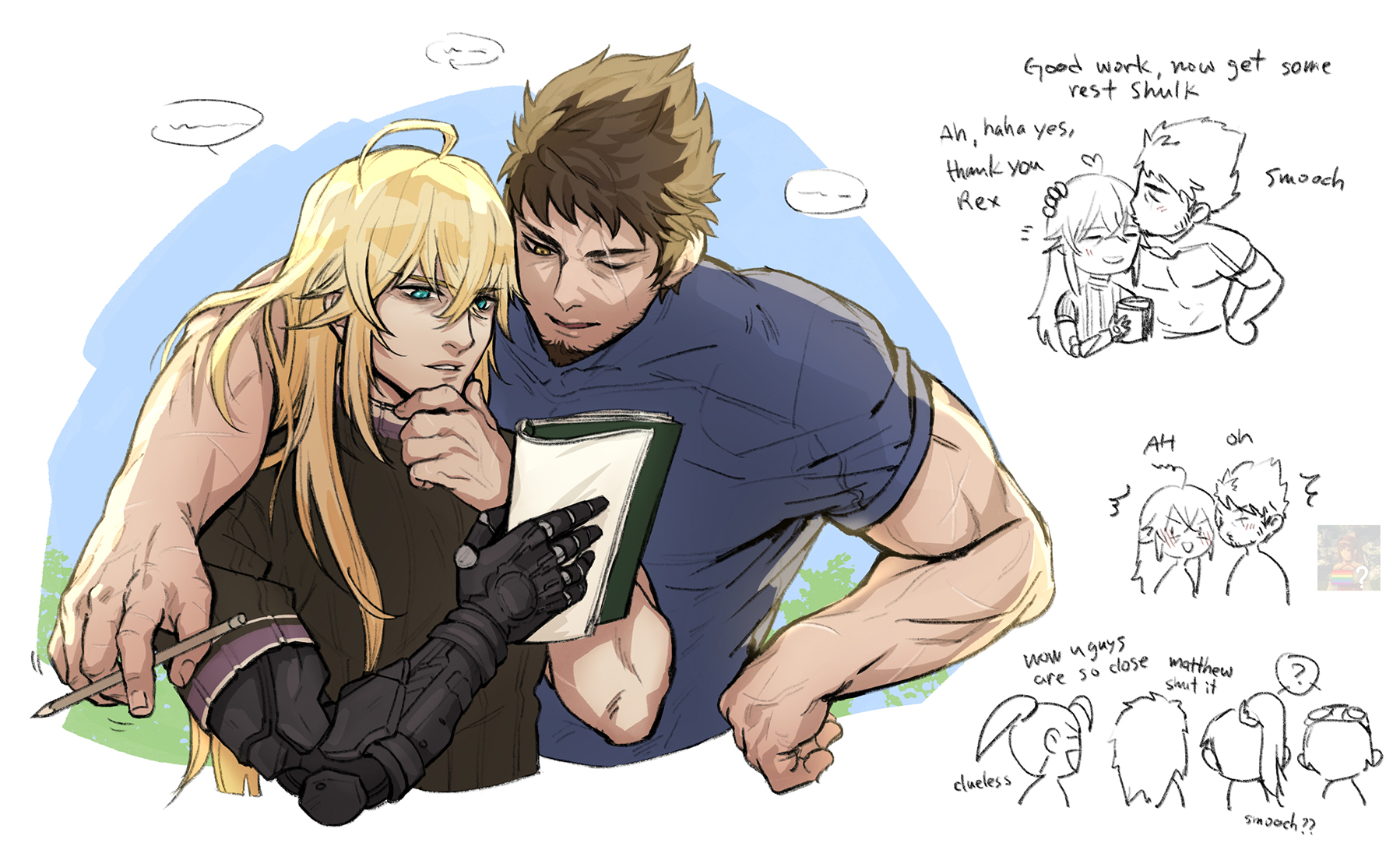 2boys a_(xenoblade) arm_around_shoulder bara beard blonde_hair brown_hair chibi chibi_inset couple cropped_torso english_text facial_hair glimmer_(xenoblade) hand_on_own_chin highres kissing_head large_hands long_hair male_focus matthew_(xenoblade) mature_male minghii multiple_boys muscular muscular_male nikol_(xenoblade) official_alternate_costume prosthesis prosthetic_arm rex_(xenoblade) short_hair shulk_(xenoblade) stroking_own_chin thick_eyebrows thinking xenoblade_chronicles_(series) xenoblade_chronicles_3 xenoblade_chronicles_3:_future_redeemed yaoi