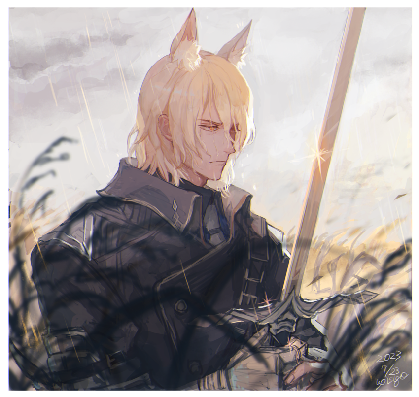 1boy animal_ear_fluff animal_ears arknights black_coat blonde_hair blurry blurry_foreground border cloud cloudy_sky coat dated frown gauntlets grey_sky holding holding_sword holding_weapon horse_boy horse_ears looking_to_the_side male_focus mlynar_(arknights) oisyox72 outdoors rain reeds short_hair signature sky solo sparkle sword upper_body weapon yellow_eyes