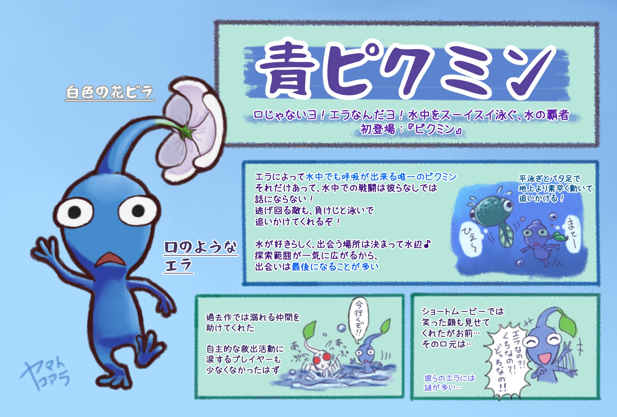 +_+ asphyxiation black_eyes blue_background blue_pikmin blue_skin bubble reference_sheet closed_eyes colored_skin commentary_request drowning flower flying_sweatdrops highres laughing leaf motion_blur motion_lines nintendo no_humans partially_submerged pikmin_(creature) pikmin_(series) signature smile speech_bubble swimming tadpole translation_request triangle_mouth underwater waving white_eyes white_flower white_pikmin white_skin wolpole yamato_koara