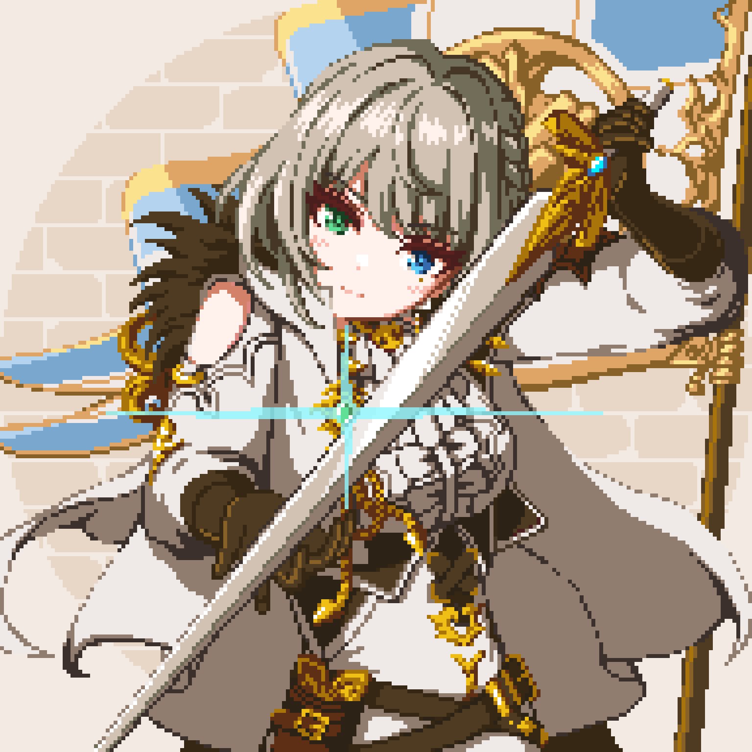 1girl flag gloves half_updo heterochromia highres idolmaster idolmaster_cinderella_girls knight nonfuron one_side_up pixel_art sword takagaki_kaede weapon