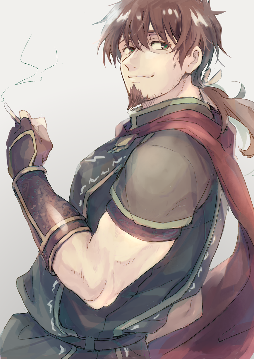1boy belt brown_eyes brown_gloves brown_hair cape cigarette closed_mouth facial_hair fate/grand_order fate_(series) gloves goatee green_tunic hair_between_eyes hair_ribbon hector_(fate) highres long_hair male_focus ponytail red_cape ribbon shirt short_sleeves simple_background smoke smoking tumikilondon5 tunic white_shirt