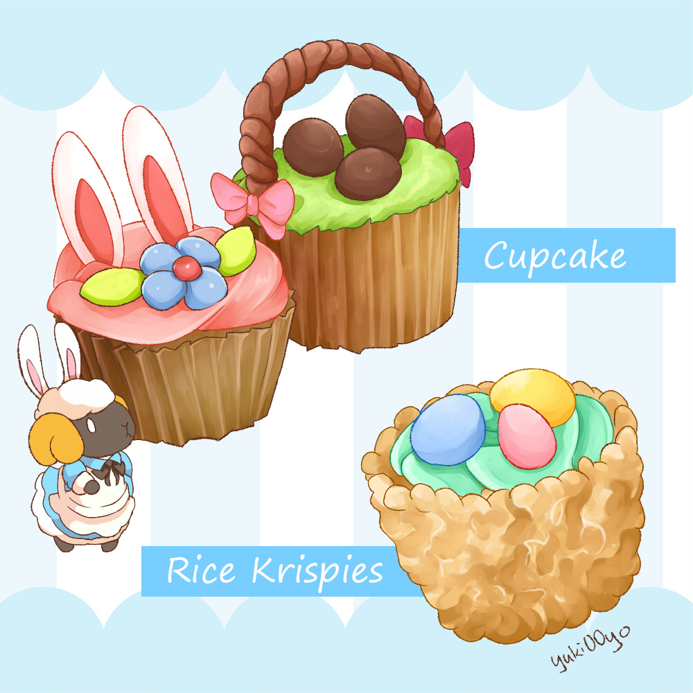 0_0 1girl :< animal_ears apron artist_name black_bow black_bowtie black_skin blue_background blue_dress blue_flower body_fur bow bowtie closed_mouth collared_dress colored_skin cupcake dessert dress english_text fake_animal_ears flat_chest flower food food_focus food_name full_body furry furry_female horns long_sleeves looking_up maid_apron original pink_bow rabbit_ears red_bow rice_krispies sheep_(yuki00yo) sheep_girl sheep_horns short_dress short_hair signature solo standing striped_background white_apron white_eyes white_fur white_hair yellow_horns yuki00yo