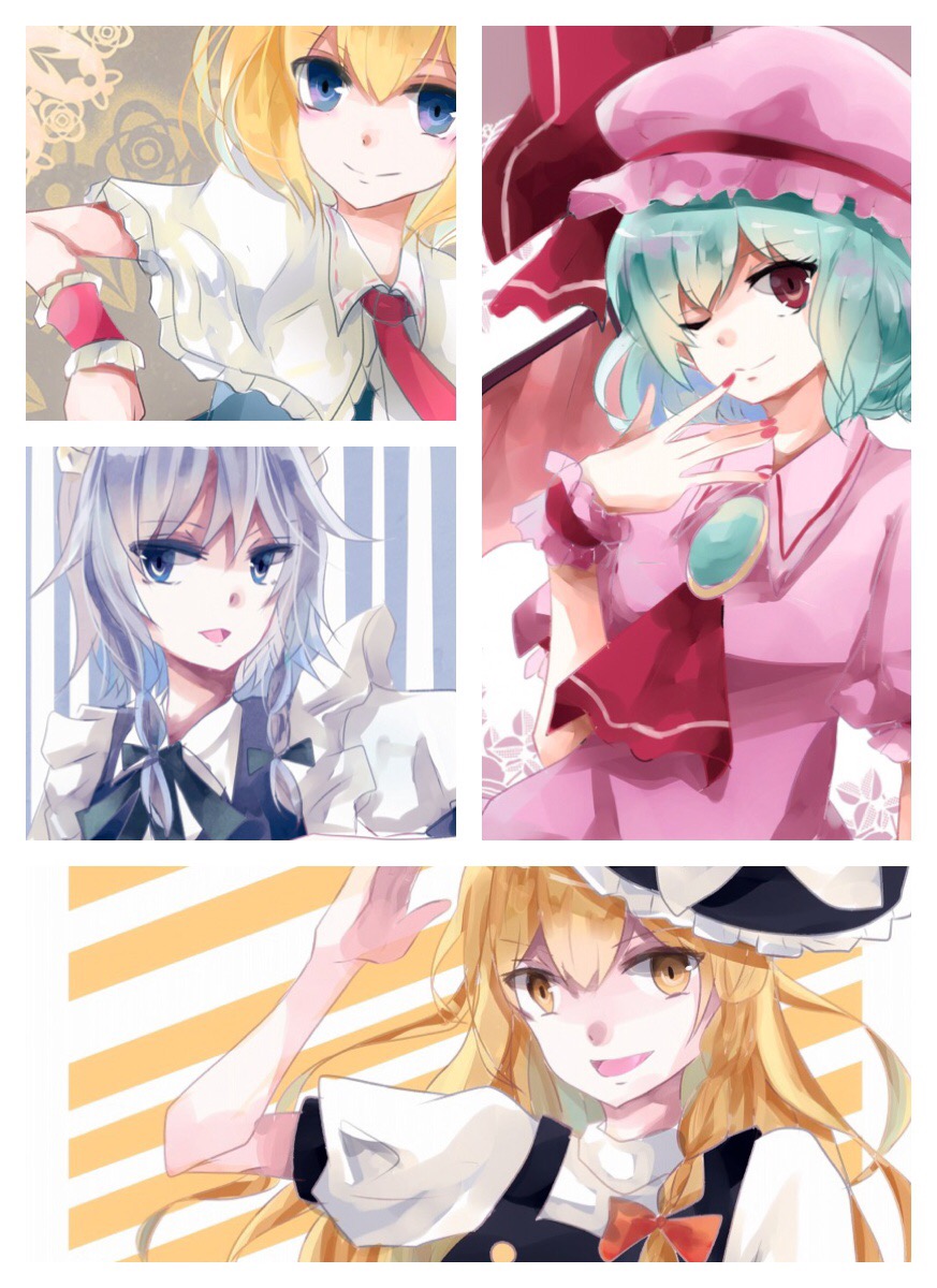 4girls alice_margatroid aqua_hair aridamikannn ascot black_vest blonde_hair blue_eyes blue_vest border brooch capelet closed_mouth diagonal_stripes frilled_capelet frilled_headwear frills grey_hair hat hat_ribbon highres izayoi_sakuya jewelry kirisame_marisa long_hair maid maid_headdress medium_hair mob_cap multiple_girls nail_polish necktie open_mouth pink_headwear pink_shirt puffy_short_sleeves puffy_sleeves red_ascot red_eyes red_nails red_necktie red_ribbon remilia_scarlet ribbon shirt short_hair short_sleeves striped_background touhou turtleneck upper_body vertical_stripes vest white_border white_capelet white_shirt witch_hat wrist_cuffs yellow_eyes