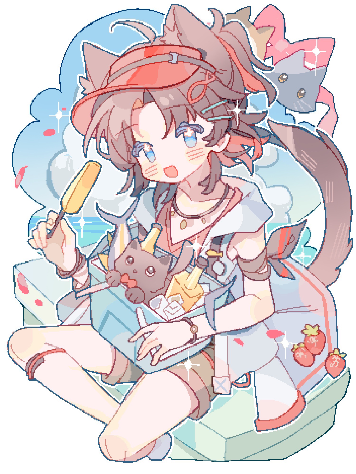 +_+ 1boy animal_ear_fluff animal_ears arknights armband bench black_armband black_cat blue_eyes blue_sky blush border bottle bow bracelet brown_hair brown_shorts buttons cat cat_boy cat_ears cat_tail cloud colored_inner_hair cooler cropped_legs fish fish_hair_ornament food fruit hair_ornament hairclip hat highres holding holding_food holding_popsicle ice jacket jewelry looking_at_viewer male_focus multicolored_hair necklace ocean official_alternate_costume on_bench open_clothes open_jacket open_mouth petals pixelated popsicle red_bow red_hair red_hat red_shirt saucer_(saucer752) shirt short_sleeves shorts simple_background sitting sky smile solo sparkle stainless_(arknights) stainless_(beach_guard)_(arknights) strawberry tail v-neck visor_cap white_background white_jacket